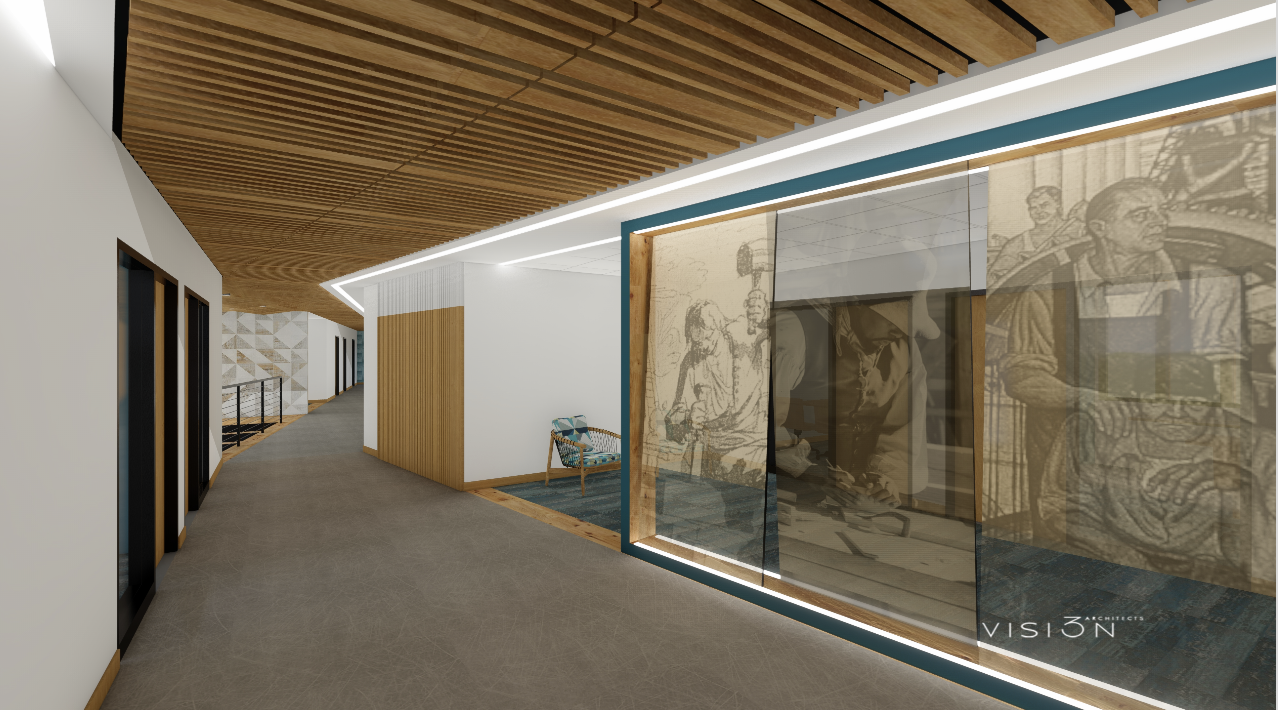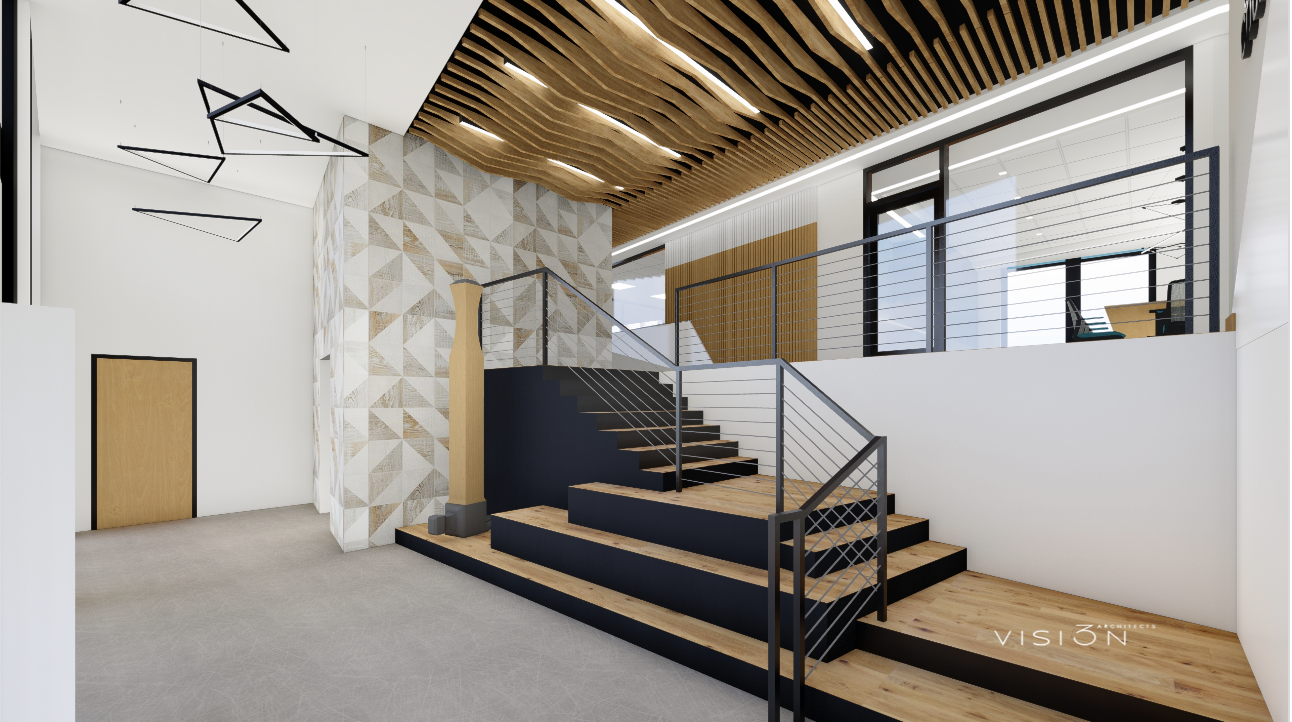 Beyond an entrance canopy supported by massive timbers is a two-story entrance hall featuring a staircase of oak treads, and a wavy wooden ceiling, cleverly composed of live edge horizontal rafters. At the top of the stairs are reception areas, a conference room, and offices. There are wood strips inserted in the ceramic tile floors and different kinds of tiles are used sparingly (there is no cute woodsy-ness, nor any dark wood paneling, as there was in the previous dungeon-like meeting hall). Vision 3’s interior design team has used a muted blue-gray palette, but the overall character is one of abundant natural light. Plus, despite being next to the highway, the building is blissfully quiet.
