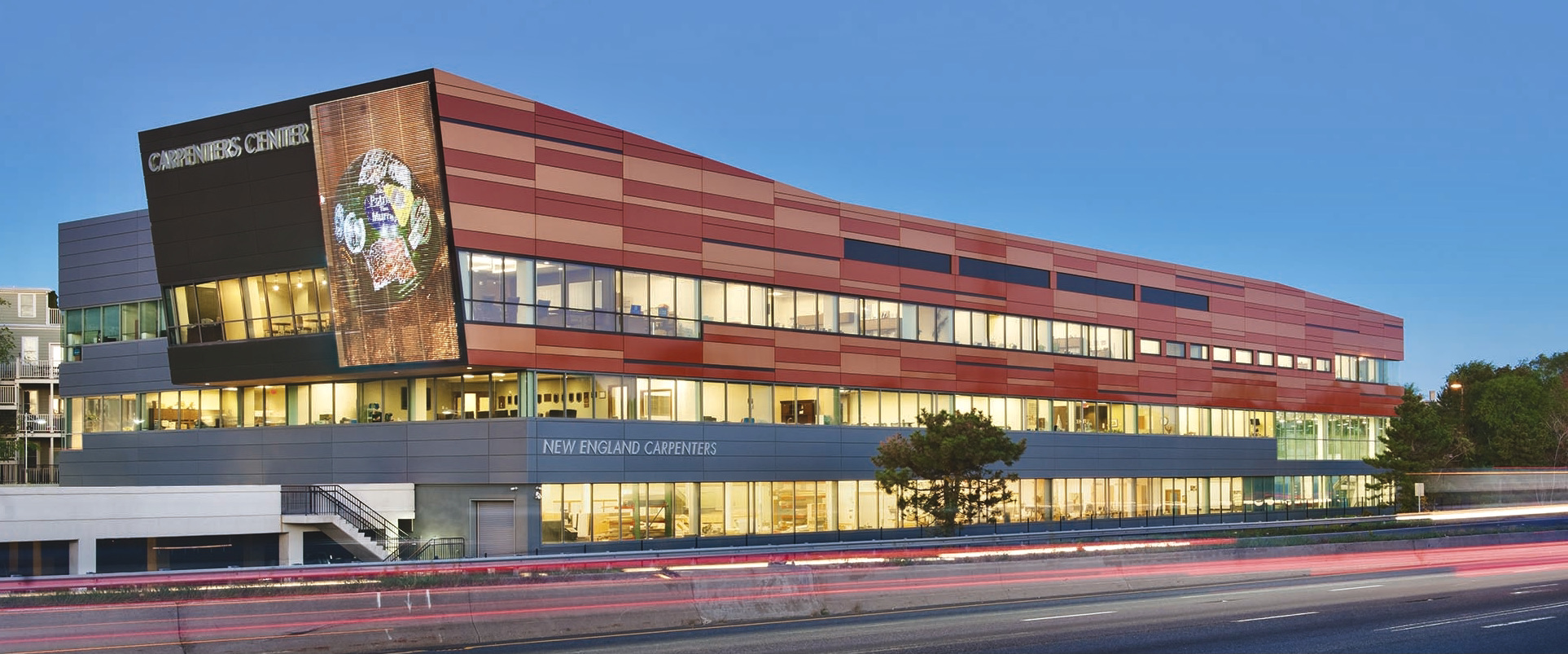 The Warwick carpenter's home naturally elicits comparison with the much larger ($20 million, 74,000 square feet) New England Carpenters Union, right by the Southeast Expressway in Boston. Not everyone likes the orange composite panels, and there was some consternation over the video screen on the prow of the ship-like building. But, the twelve-year-old Carpenters Center, designed by the Boston firm of ADD, has become an inescapable landmark.