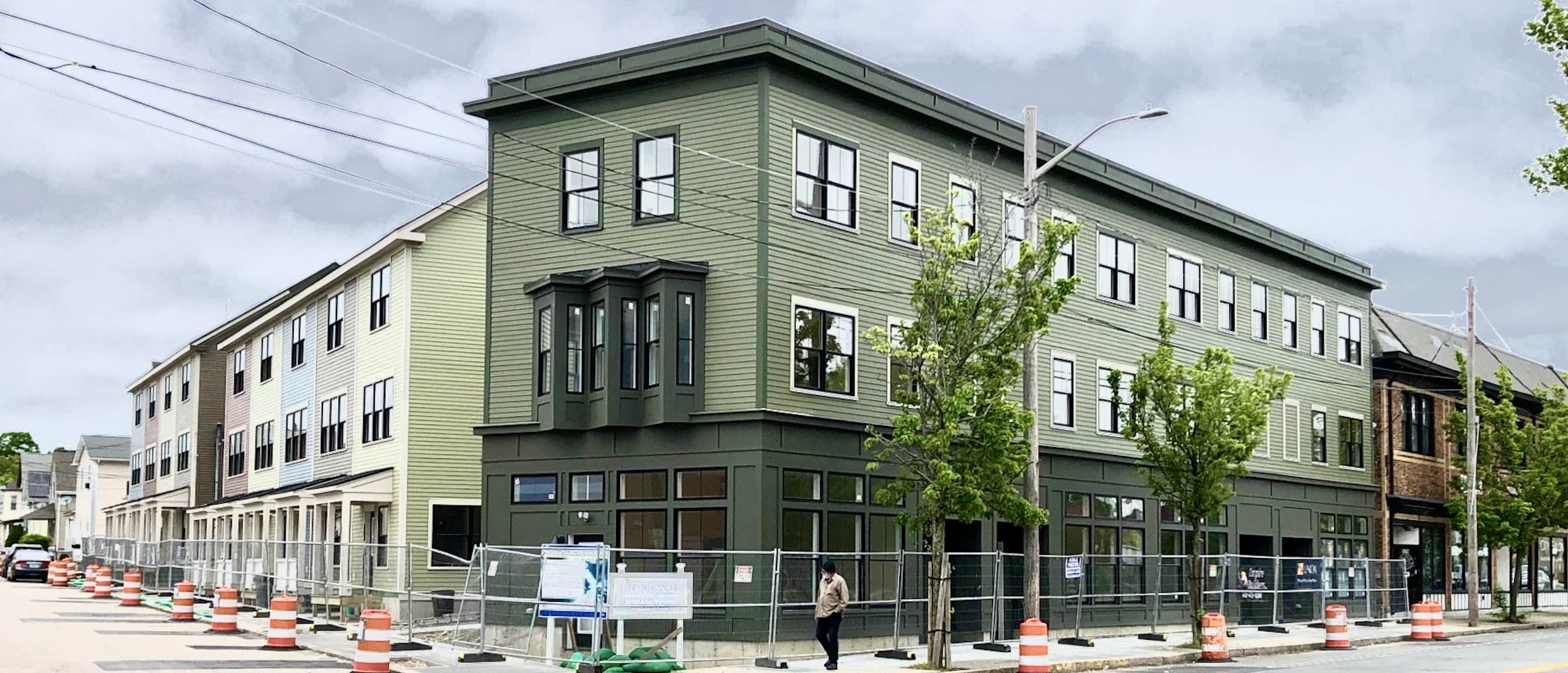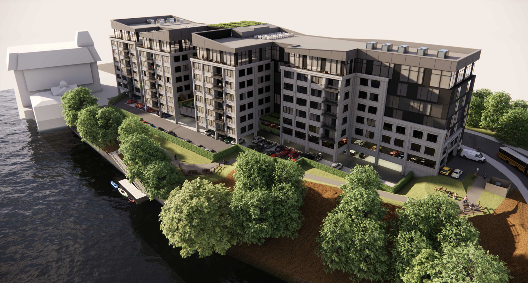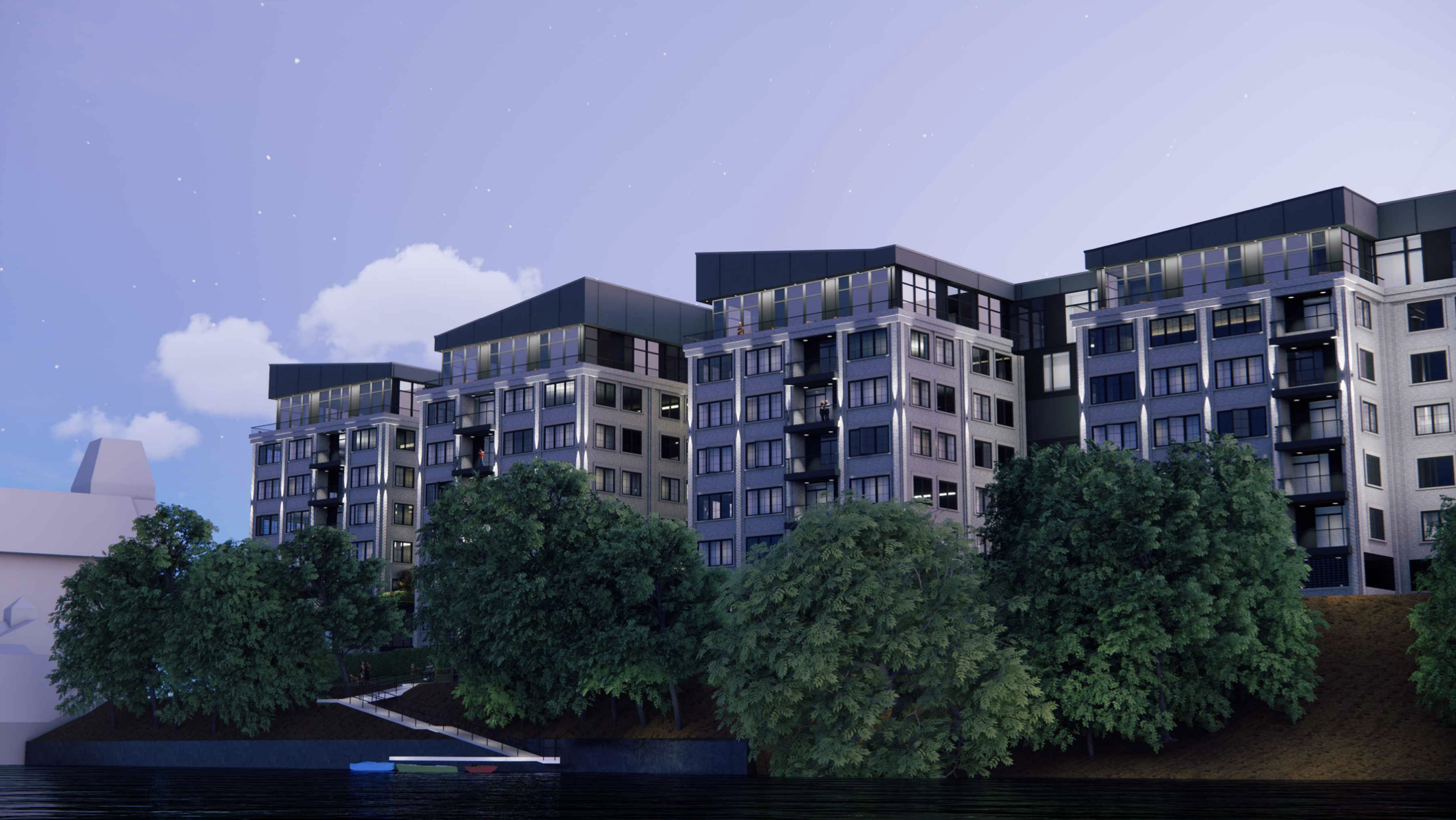 Project architect Kevin Diamond has merely wrapped the building dimensions in the most banal skin imaginable. The City Plan Commission should be an advocate for sensible planning and act as a guardian against such ill-conceived and destructive schemes. Yet, at the recent most CPC hearing, Diamond went unchallenged when he declared that his work will result in a ”transformational property” on “an amazing, vibrant, activated site.” With further unsupported hyperbole, the architect boasted that his behemoth would “reconnect the neighborhood with the water,” and “activate the coastal greenway.” Aside from the kayak dock, one wonders how a clunky seven-story block of flats would accomplish this. Does anyone other than the construction-at-any-cost-to-history-and-livability crowd believe this is the only barricade against hordes of the homeless? (In the drawings submitted to the CPC, there are no floor plans of apartments–would they be larger than the near-windowless flats in the same developer’s proposed Wickenden Street townscape blaster? Will this mix of condos and rental units be luxury living, or simply more student ghetto? No “affordable” spaces are planned.)