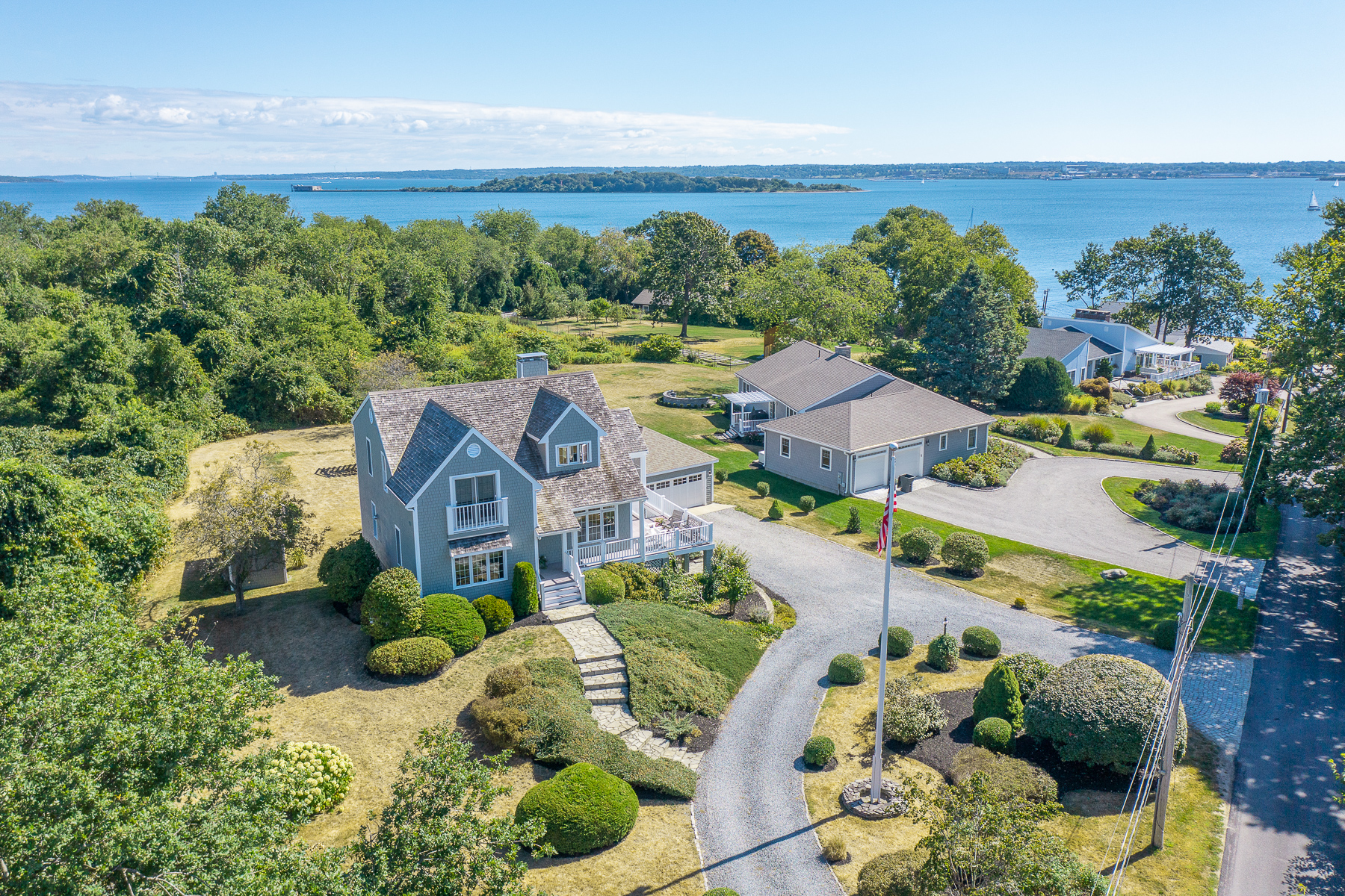 Perched on a quiet road on East Passage, you will find this coastal home with water views of Narragansett Bay. This property is beautifully landscaped and offers over an acre of land with room to expand. Watch the sunrise with a cup of coffee on your screened in porch and expansive wrap-around deck. Walk down to the end of the road where you have water access to swim. An eat-in kitchen offers a gas double-sided fireplace opening up to an expansive living and additional dining room. The main level is the perfect place to entertain your guests with water views from every room. Your second-floor primary suite boasts hardwood floors, a private balcony, walk in closets as well as a large en suite bathroom with soaking tub. A lower level has two guest bedrooms, a living room currently used as an office with French limestone floors and a shared bathroom that has recently been updated with a marble top dual vanity. There is also a wine room on this level. As you walk outside to the backyard you will find an outdoor shower, pergola, garden shed and room to add a pool with backyard water views.