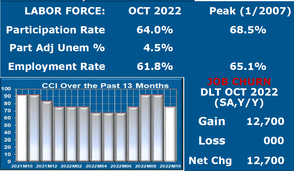 Clearly, its values have been slipping since April, leading to the expectation that deteriorating monthly performance would eventually translate into the annual changes. This call was made more difficult by the fact that October employment numbers are often changed with rebenchmarking, which may well be the case this year. So, any speculation that what we are witnessing is the first stage of LO (Last Out) is clearly premature. Ironically, large amounts of unspent federal funds received by Rhode Island, when spent in the coming months, will give us a boost through much of 2023, potentially dethroning us from the LO designation!