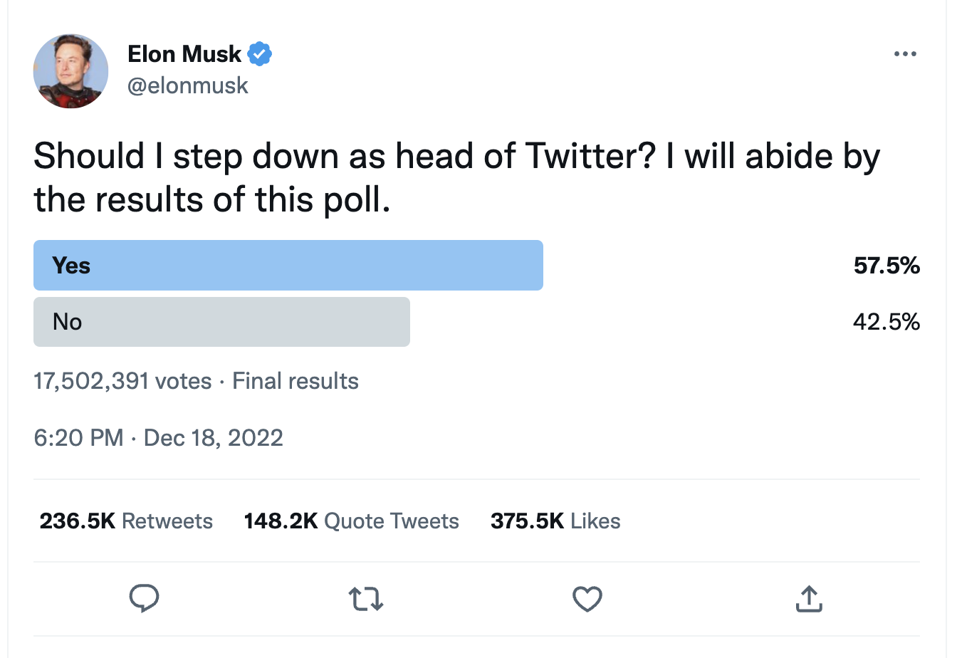 More than 17 million users had voted by the time the poll closed after 6 a.m. ET, with 57.5% saying he should leave as head of the company he bought in October for $44 billion.