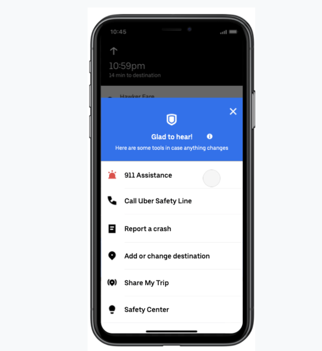 Riders and drivers can let Uber know through the app that all is well, or take other actions like contacting 911 through the emergency button or reporting the issue to Uber’s Safety Line.