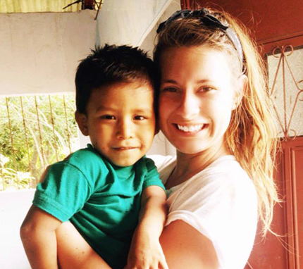 Paige Dellerman, a junior at URI, holds a child in Guatemala. She designed an Alex and Ani bangle that benefits clean water charities in poor countries.