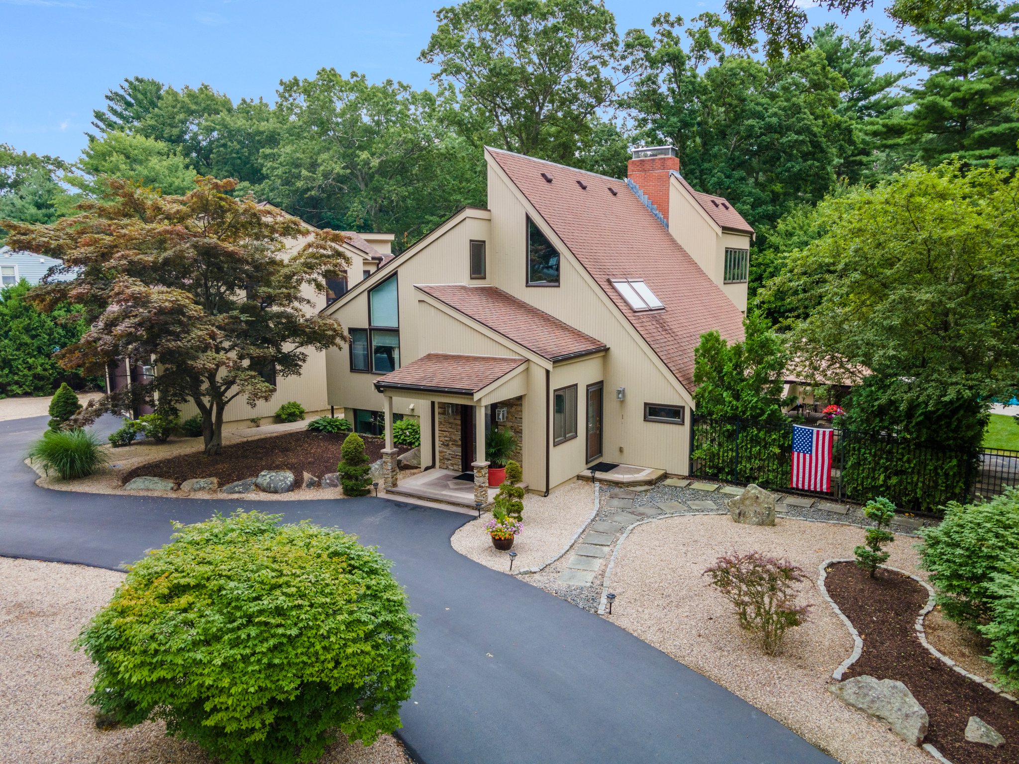 Welcome to 1 Tall Pines Drive, an impressive contemporary-style home on Barrington’s New Meadow Neck peninsula in the Hampden Meadows neighborhood. This five-bedroom, three-bathroom home, nearly 4000 square feet, is a blend of modern design and cozy elegance. On the main level, a granite and stainless kitchen has a dining nook with banquette seating. The dining and family rooms, with floor-to-ceiling brick hearth, have sliding glass doors that open onto the private patio. Front-to-back living room, with vaulted ceiling and fireplace has lovely balcony with views of the pool and lawn. The second level has two large bedrooms and a full bathroom. Off the second level is a sunny loft, currently used as a private office. The third floor hosts the primary suite which has a spacious fireplaced bedroom, large bathroom with jetted tub, shower, two walls of closets, and dressing area with sink and vanity. A beautiful addition to the house includes two generously sized bedrooms and a full bathroom, ideal as an in-law “apartment”, guest space, or au pair quarters. The ground level of the addition features a private entrance and has a fully plumbed and heated 5 x 8 (approximately) room ready to be a bathroom or kitchenette. The finished and heated basement level of this expansive home hosts a dedicated laundry area, a TV or rec room, pantry and more storage! Meticulously maintained, security system, fenced yard. Minutes to Barrington’s town center, town beach, shopping and dining. Award-winning school district.