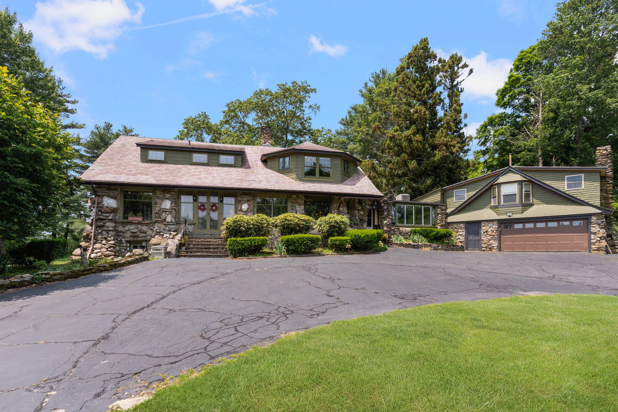 Nestled atop a picturesque hill near Glocester Country Club, this circa 1900 cobblestone home combines historic grandeur, master craftsmanship, and the old-world charm of a European Country Cottage with every modern comfort. The home encompasses over 4,000 square feet of uniquely designed living space, and offers 5-6 bedrooms, including two separate living spaces ideal for multi-generational living or investment income. Designed for both indoor/outdoor entertaining and comfortable everyday living, the home features three stone fireplaces, and beautifully preserved architectural details throughout including stunning inlaid hardwood floors, soaring coffered ceilings, stained glass windows, gorgeous built-ins, and an oversized flagstone patio and wooden deck ideal for lazy days and barbeques. The functional floor plan includes a renovated kitchen with an adjacent potting area for the home gardener, generous living areas, two stone sunrooms with expansive windows and a sun-drenched enclosed porch. Enjoy the privacy of mature trees and lush perennial gardens and a central location near the highway for an easy commute into Boston or Providence. A spacious 2 ½ car garage, abundance of storage, and modernized systems throughout ensure the home is truly move-in ready. New 5-bed septic system being installed. This remarkable property offers rich character, space, setting and location. A rare and unique opportunity to enjoy timeless charm in a living piece of history.