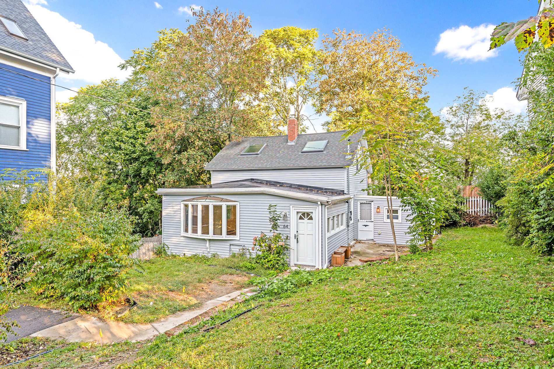 64 Evergreen Street is a quaint East Side cottage drenched in southerly light. Nestled into the corner of a 4800 square foot lot this home has unique privacy from the street and neighbors. With just refreshed hardwood floors throughout, the main level opens to an entry foyer and into a high-ceiling double parlor with great entertaining options. The open kitchen has gorgeous soapstone counters and the perfect triangle layout for cooking and baking. A fully renovated first floor bathroom is perfect for guests, and a laundry room completes the first level. The upper level again shines with wide plank hardwoods in two bedrooms and another full bathroom. Skylights in both rooms bring additional sunlight. This home has younger systems and a newer roof. A great turnkey option to condo living.