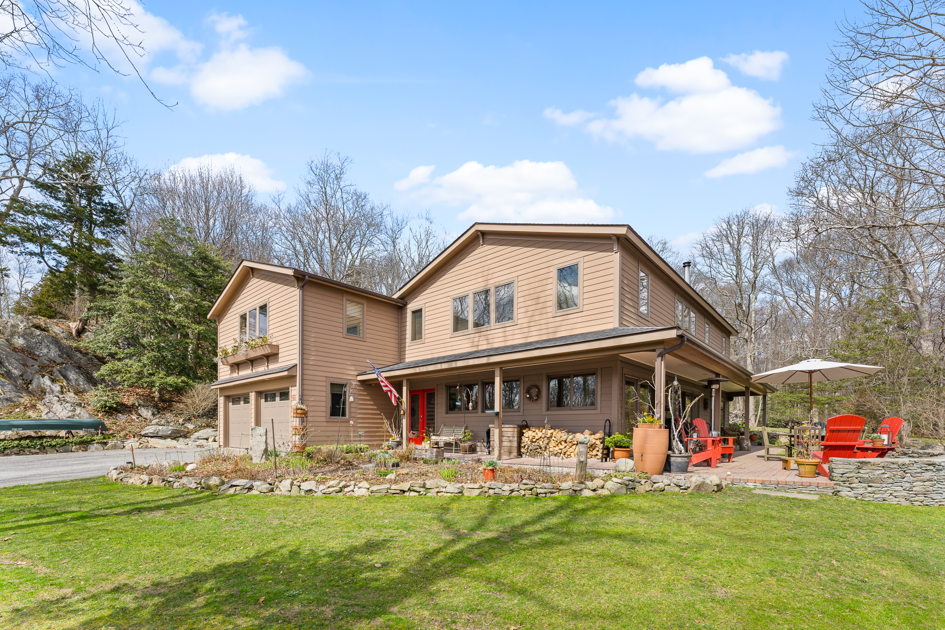 A true Nature Lover's Paradise, located in the Historic Stonebridge area. Surrounded by stone walls, granite ledge and stone outcroppings along with beautiful perennial gardens and mature plantings. This secluded property is home to lots of wildlife, especially birds of all kinds. Custom built with excellent fit and finish the home was designed to blend into the slope of the land allowing for two beautiful brick terraces, one-off each level on the east and west sides, perfect for enjoying both the start and the end of the day. The open floor plan along with an abundance of large windows and glass patio doors offers wonderful views and natural light. The well-appointed kitchen blends into a large family room with radiant heat, an efficient wood stove, and a dining area. A first-floor bedroom with private patio and full bath is ideal for guests or primary bedroom. The second floor has a large open foyer with beautiful custom wood floors and railings. A very comfortable primary bedroom with beautiful windows, large bath, and a walkout western-facing brick patio. An additional bedroom, large office and a full bath complete this lovely space. Above the garage is a 550 sq. ft. studio/bonus room with windows on all four sides, a rear door with access to a patio and a separate staircase. Located on a quiet cul-de-sac within walking distance to several fine restaurants, coffee shops, a great fish market, and a beach. One mile from Rt. 24, 30 minutes to Newport and one hour from Boston