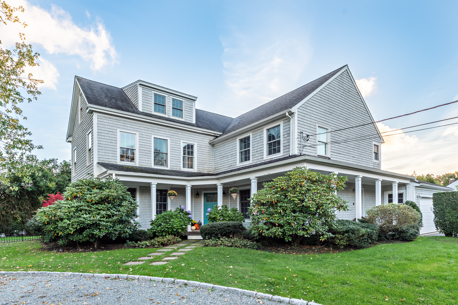 Coveted Indian Avenue corner lot. Traditional New England shingle-style home with gracious wrap-around porch. Circular driveway with stone edging and manicured privet hedges. Completely renovated in 2022. Luxury farmhouse interior design. Butcher block countertops and large center island. Six burner Wolf range, sleek wood-paneled Bosch refrigerator, and wine fridge. Two walk-in pantries and sitting area with wood fireplace opening to a porch perfect for al fresco dining. Shiplap entry/mudroom with sleek built-ins. First floor office with adjacent powder room. Oversized coat closet with custom barn doors. Living room features coffered ceilings and handsome white brick gas fireplace with reclaimed wood beam mantle. The second floor includes two wings, a guest wing with three tranquil suites and beautiful brand-new white stone and marble baths and a separate owners’ wing. The private primary retreat offers a sunlit bedroom with winter water views, two walk-in closets, a balcony and marble bath with dual vanities and luxurious round soaking tub, heated floors and a spa shower. A sun-lit third-floor space perfect for a home office or studio. The finished basement has been equipped as a state-of-the-art fitness center. An attached two car garage and amenities such as an outdoor shower, fire pit, gardens and shed make this the ultimate coastal sanctuary. Minutes from the world-class beaches, dining and shopping.