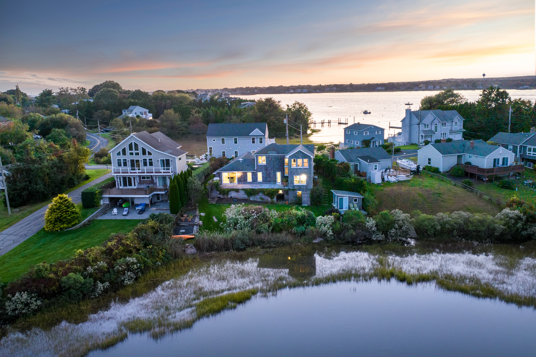 This distinctive waterfront Great Island home was designed to have a natural comfortable feel and to take best advantage of the sun, its light and its reflection on the water with windows strategically placed to offer expansive views from every room. You will find an interior with a contemporary flair and a flexible, open layout. The clean lines and streamlined feel of the home do not hide its quality and craftsmanship including its Italian Valcucine kitchen with Crystalite countertops and high-end appliances, maple hardwood floors throughout, marble floors in the baths. The second-floor primary suite was designed as a private oasis with windows on east and west sides to catch the sunrise and sunset on the water, its own private deck and an office. The exterior boasts Garapa Brazilian wood decking, 50-year roof, lovely plantings, and 126 feet on the pond with its own hideaway and deck. The neighborhood beach is just steps away where you can find mussels and clams and enjoy water activities on the Great Salt Pond. This is a unique and special property for a Buyer who wants to enjoy a home that peacefully complements and blends the inside with nature's beauty all around.