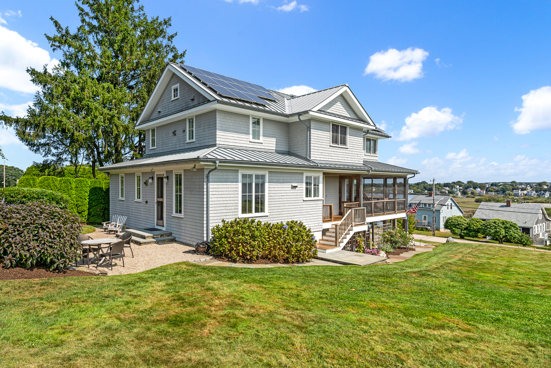 Experience breathtaking views and coastal living at its finest in this thoughtfully designed 4 four bedrooms, three and one half bathrooms beachside home. Built in 2007, this home features geothermal heat and solar panels that make running this home incredibly efficient. Located just 600 steps from the beautiful Wequague Association Beach, this move-in ready home is the perfect blend of luxury and comfort. A well-appointed chefs kitchen is open to the living area which makes entertaining a dream. The living area with French doors open to the expansive screened-in porch, offering serene views of the ocean creating a perfect spot for morning coffee, evening relaxation or a large family dinner. Upstairs the primary suite has a walk-in closet and an exquisite bath with a soaking tub. The landscaped back patio is an outdoor oasis, perfect for grilling or dining with family and friends. And the lower level has a large two-car garage, laundry area, exercise area, wine refrigerator, and extra storage space. You truly do not need to do a thing in this home except bring your family and flip-flops and start enjoying the coveted Narragansett lifestyle.