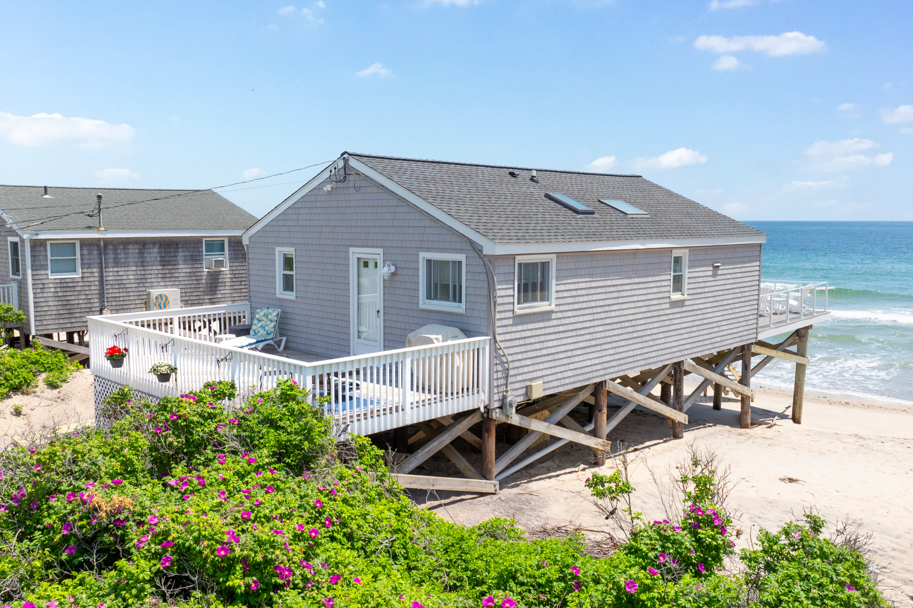 Move right into a two-bedroom oceanfront retreat on Green Hill Beach. Relax on the multi-level decks with unobstructed ocean views to Block Island. Down your steps to the pristine Green Hill beach that stretches on for miles to Charlestown Breachway. The kitchen and living area are open floor plan with endless ocean views. Office/study offers additional sleeping options for guests on the main level. The two bedrooms are upstairs. The primary en-suite has vaulted ceilings giving an open airy feel. This charming beach front home also has the benefit of municipal water. Parking for three to four cars. This is an extraordinary property.