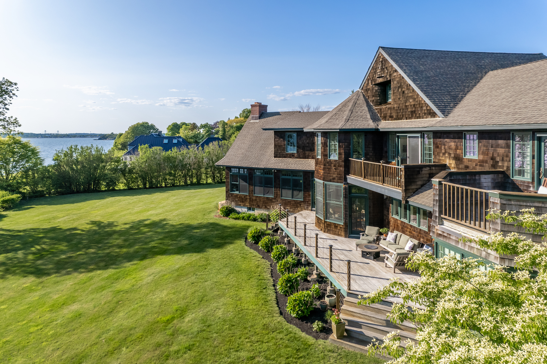 Waterfront Nantucket style custom home in highly sought after South Tiverton location. The open and airy layout was designed to capture water views from almost every room. The well-thought-out first-floor plan includes a chef's eat-in kitchen with stainless steel appliances and custom cabinetry, a family room with soaring ceilings and wood burning fireplace, formal dining room, powder room, laundry room, and primary bedroom suite with a gas fireplace. Upstairs there are three additional bedrooms, two ensuites, a bathroom, office room and a large finished room over the three-bay garage, perfect for multiple uses. A large West facing deck with spectacular sunset views over the Sakonnet River provides ample space for outdoor entertaining or a relaxing perch to watch passing boats. Closer to the shore there is a custom-designed terrace with a fire pit perfect to enjoy morning coffee or afternoon beverages. Newly constructed stairs lead to the river's edge, where permitting for a deep water dock is obtainable. The spacious yard has room for a pool or tennis court and is professionally landscaped with a variety of plant material and mature trees and ample privacy.