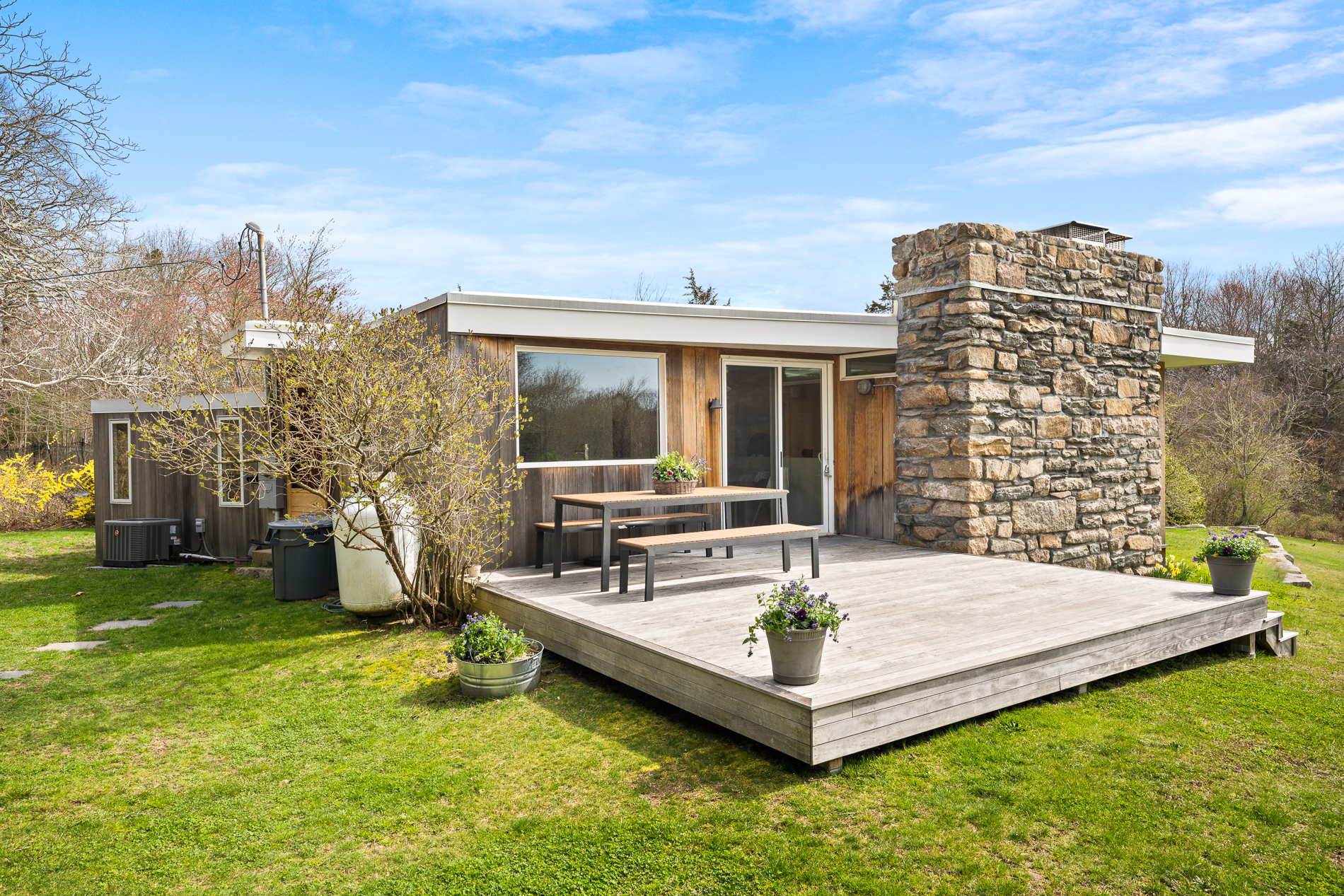 This Spectacular mid-century modern home designed by famed architect Rockwell DuMoulin and featured in Progressive Architectures “Pencil Points” in 1944 sits on over 9 acres of rolling fields, stone walls and a pond and is bordered by land trust. It maintains its original character but with many modern-day updates. A recently renovated cooks kitchen provides lots of space for family and friends to join in on prep or just keep you company while you prepare the meal. The large living room with romantic stone fireplace and floor to ceiling windows is a great place to gather on cool summer nights or snowy winter days. With 3 beds and 2 full baths plus a studio with half bath and outdoor shower there is plenty of room for family and friends. Take a boat ride on the pond, a dip in the hot tub or let the kids play a game of tag while you sit around the fire pit. This is the perfect place to unwind. You are only 5 minutes from Matunuck Beach, East Matunuck State Beach or Matunuck Oyster Bar. The Amtrak station is a 12-minute drive and Newport is 25 minutes away. If you are looking for a home with character, charm, and privacy you need to look no further.