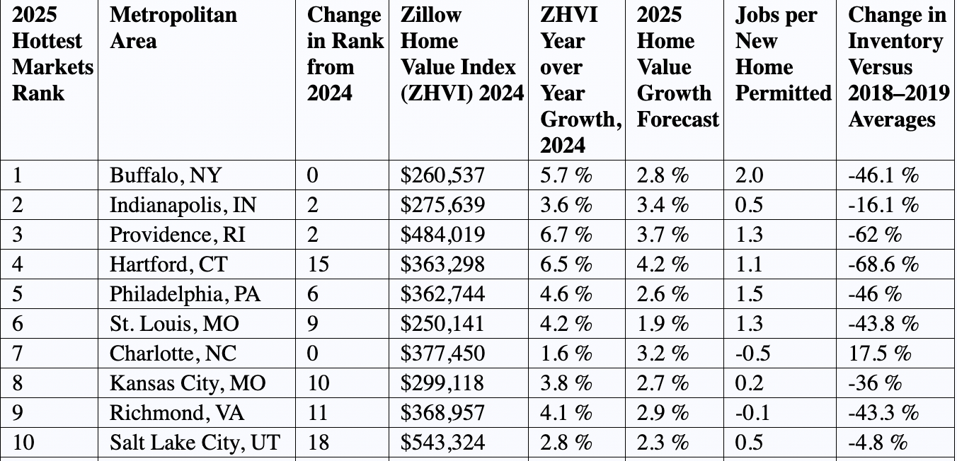 The top three are Buffalo, Indianapolis and Providence on Zillow's 2025 list of hottest housing markets, where competition among buyers will be strongest.