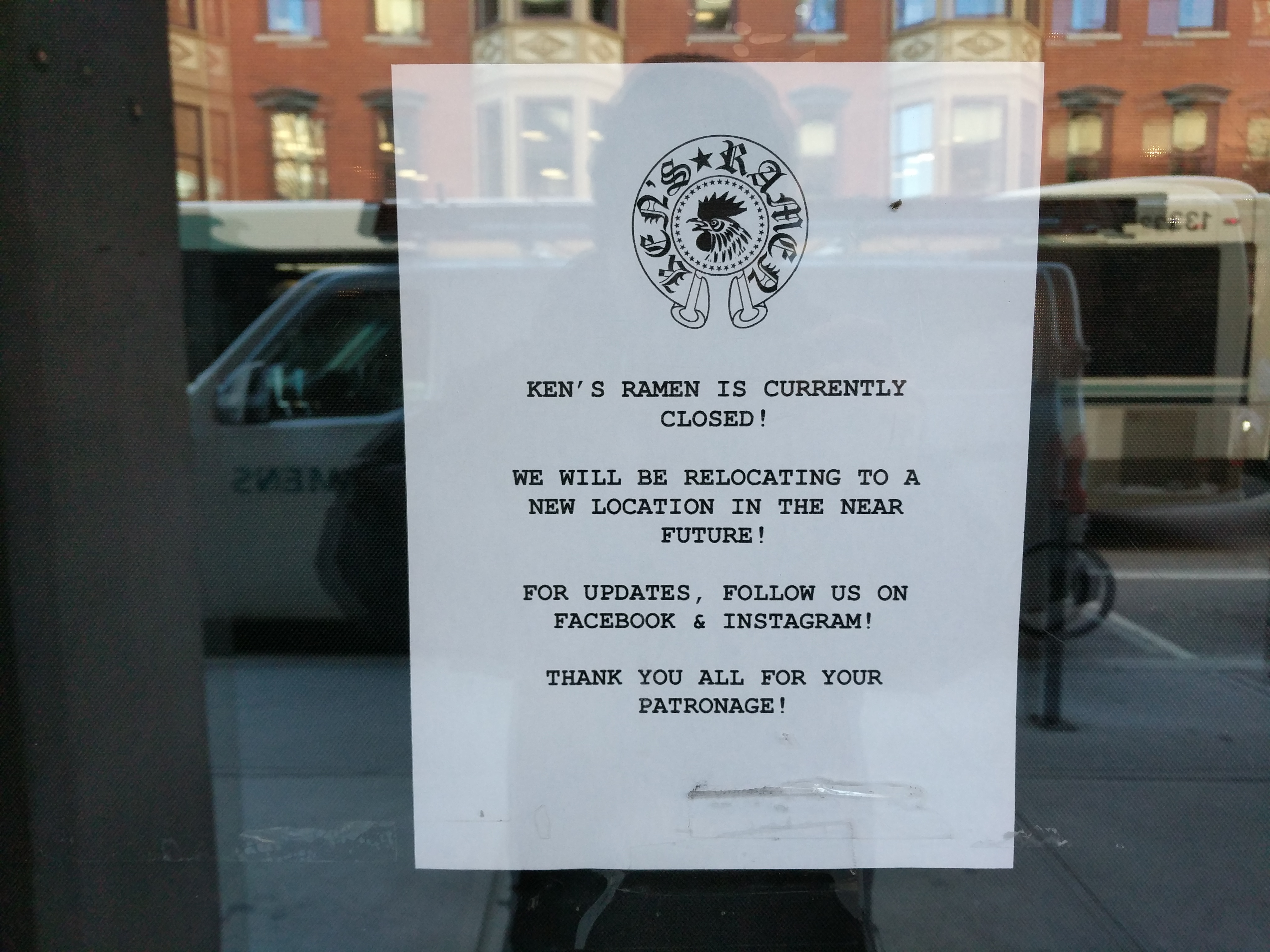 “Ken’s Ramen is currently closed. We will be relocating to a new location in the near future. Thank you all for your patronage,” reads a sign on the door of the restaurant.