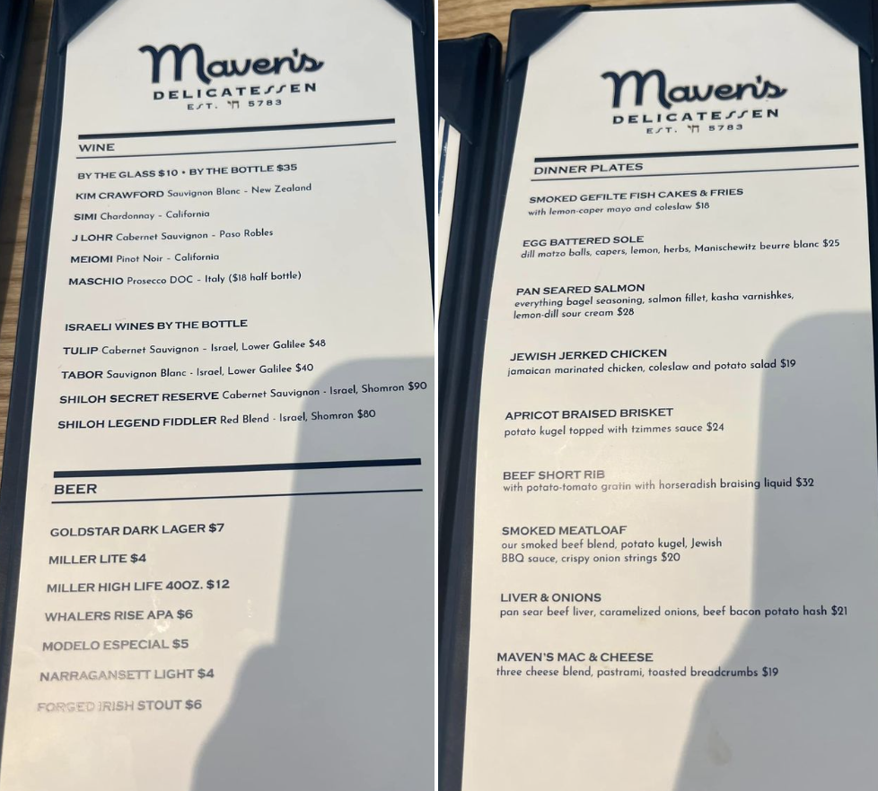 Known for its bagels and sandwiches for breakfast and lunch, Maven's dinner entrees now include such specialties ad “apricot braised brisket,” beef short ribs with horseradish braising liquid, Jewish jerked chicken, and smoked meatloaf.