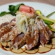 Roast pickle-brined chicken breast, Penne with asparagus, Grilled boneless Pork Chop