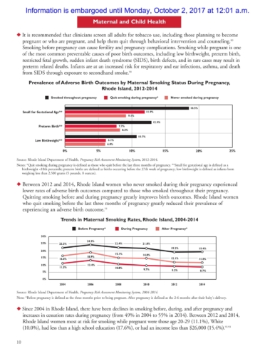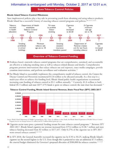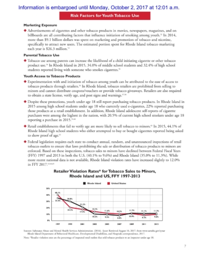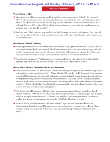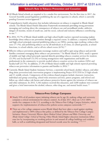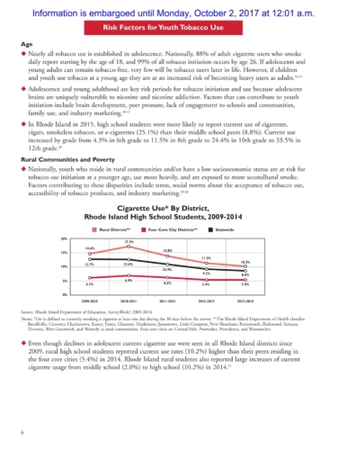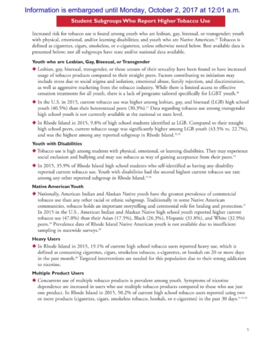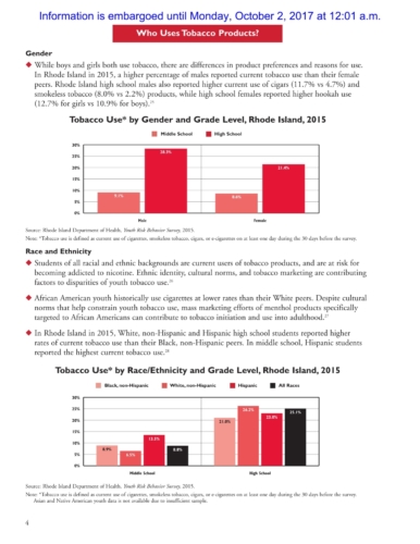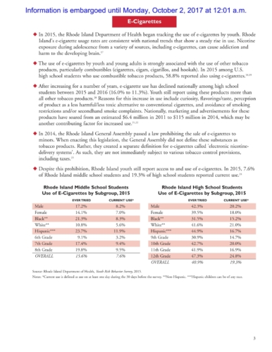 The report also shows that in 2015 Rhode Island had the lowest self-reported rate of current cigarette use for both middle (0.9%) and high school (4.8%) students among ranked students in the U.S.