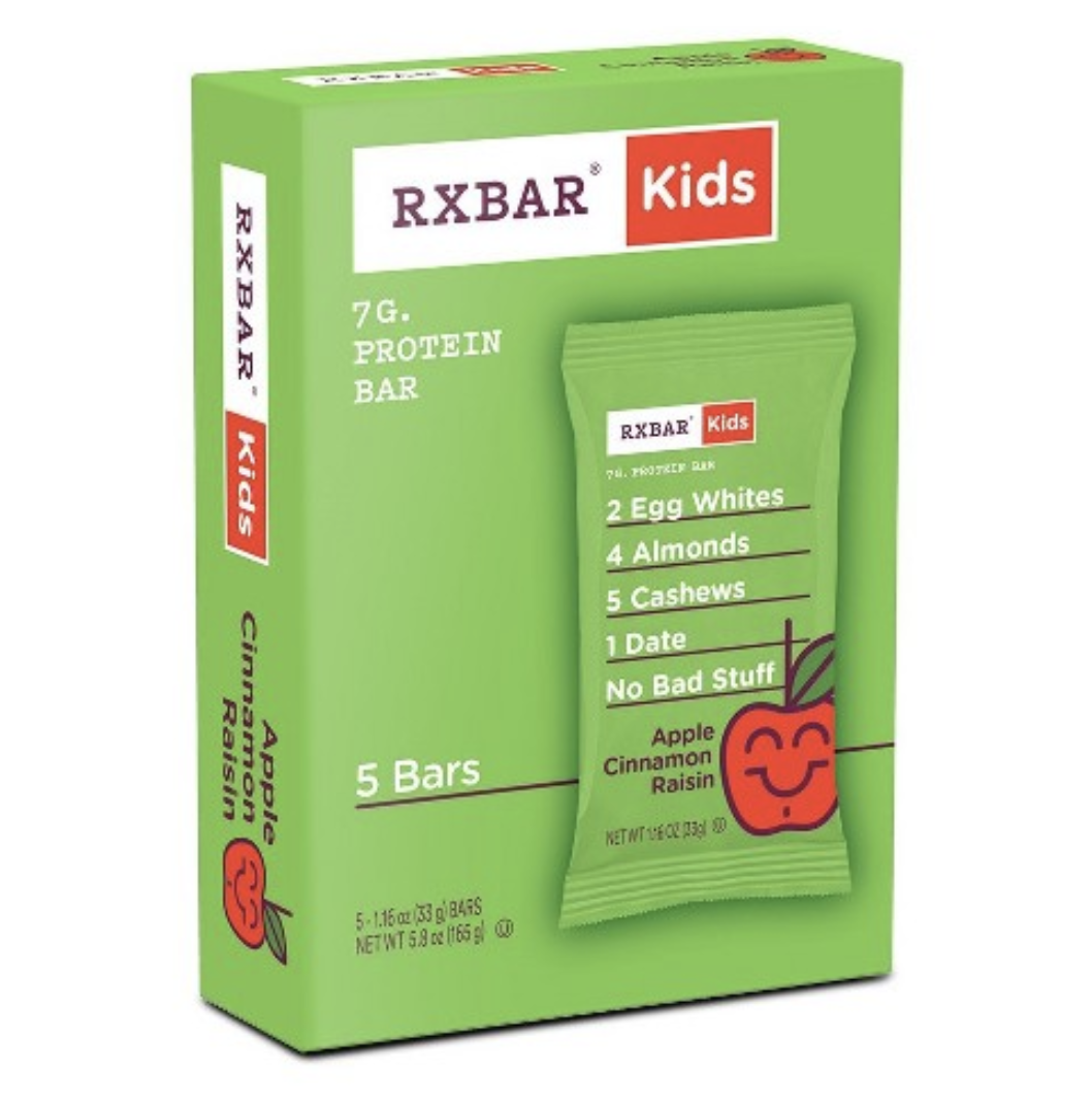 - RXBAR Kids: Apple Cinnamon Raisin, Berry Blast, Chocolate Chip