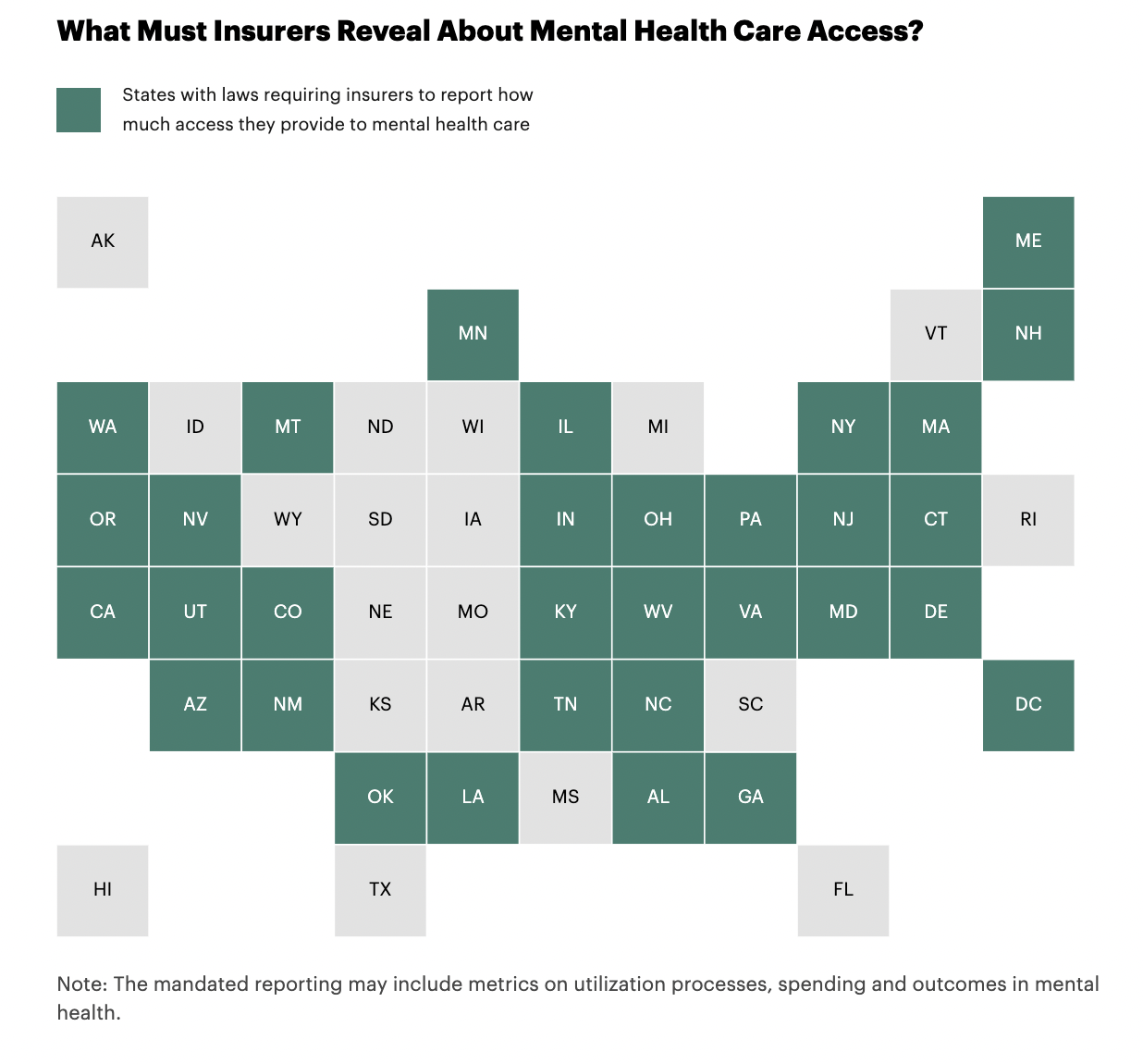 To hold insurers accountable, at least 31 states and the District of Columbia have passed laws requiring them to report how much access they really provide to mental health care.
