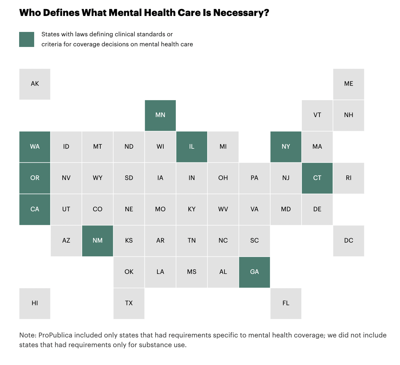 ProPublica reporters delved into the laws in all 50 states to determine how some are trying to chart new paths to secure mental health care access.
