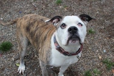 My name is Otis! I am a 9 year old large sized American Bulldog mix. I have been around children and have lived with a cat before. I used to love snuggling with my cat friend in my previous home and especially loved when she groomed me. I can be a little reactive to dogs on leash but am working on it with staff and excelling (what can I say, I love treats!). I would do best as an only dog because of this. My friends here at PARL are sending me home with 3 free training sessions to help my new adopters work with me on my leash reactivity. Are you looking for a spunky senior to cuddle up with at night! I may be the one for you. Come meet me today!