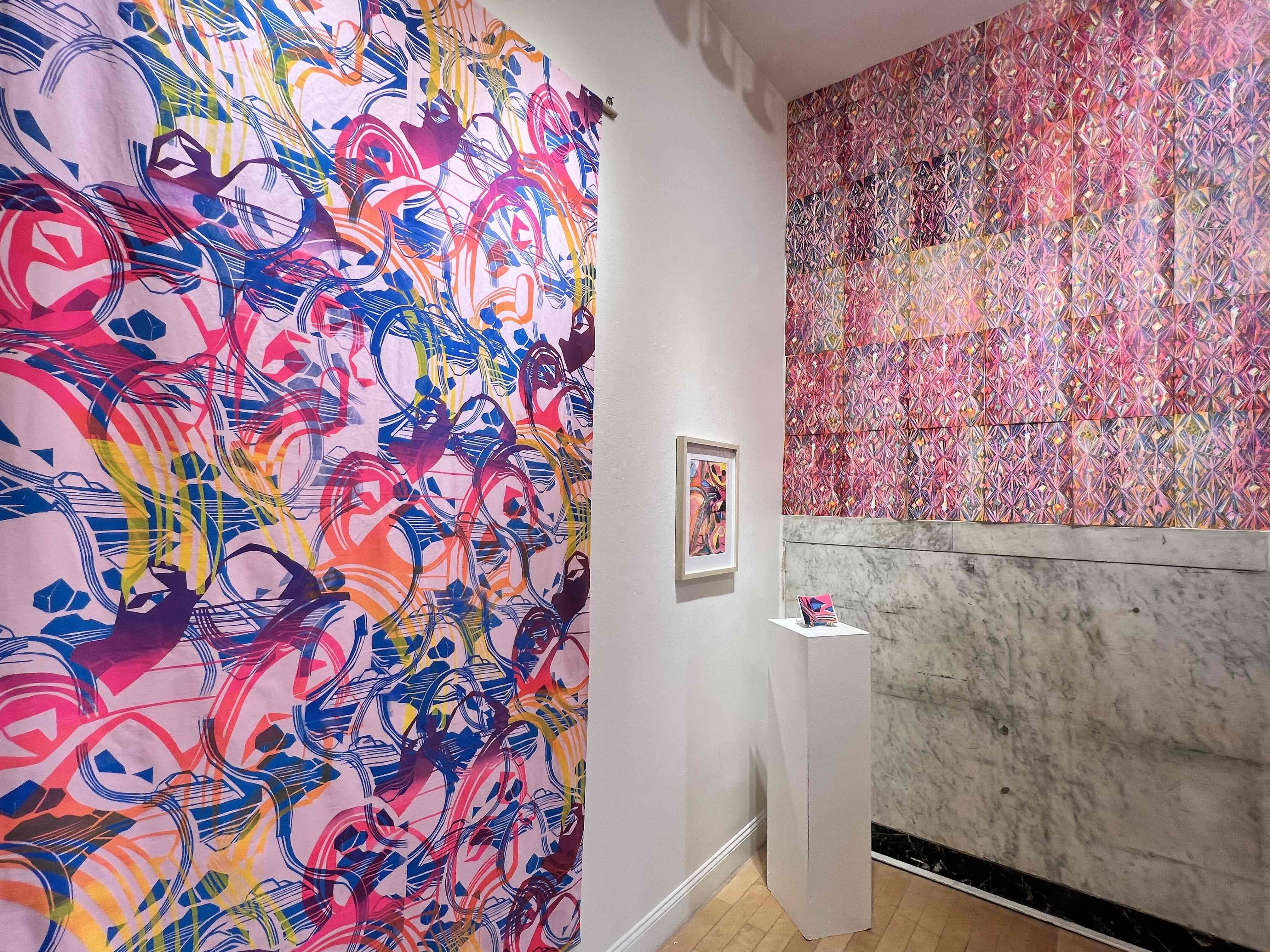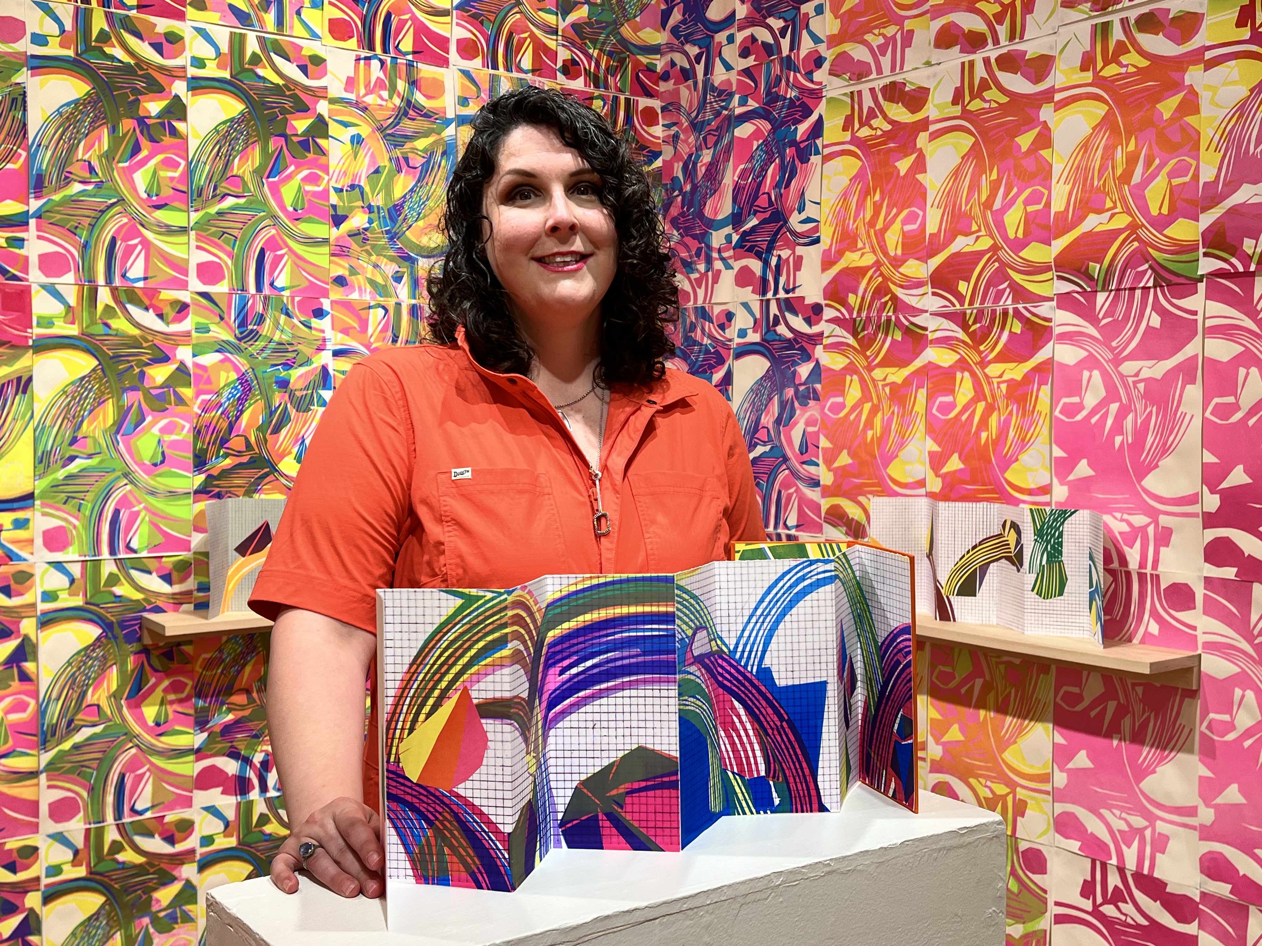 Bright colors beckon viewers into AS220’s galleries at 93 Mathewson Street in downtown Providence. The work on view highlights the multi-faceted production of printmaker, book artist, coder, and educator Lara Henderson, whose solo exhibition Bridges is on view through July 27. A maker who focuses on distinct patterns and eye-catching designs, Henderson is an artist to know and her show is a must-see.