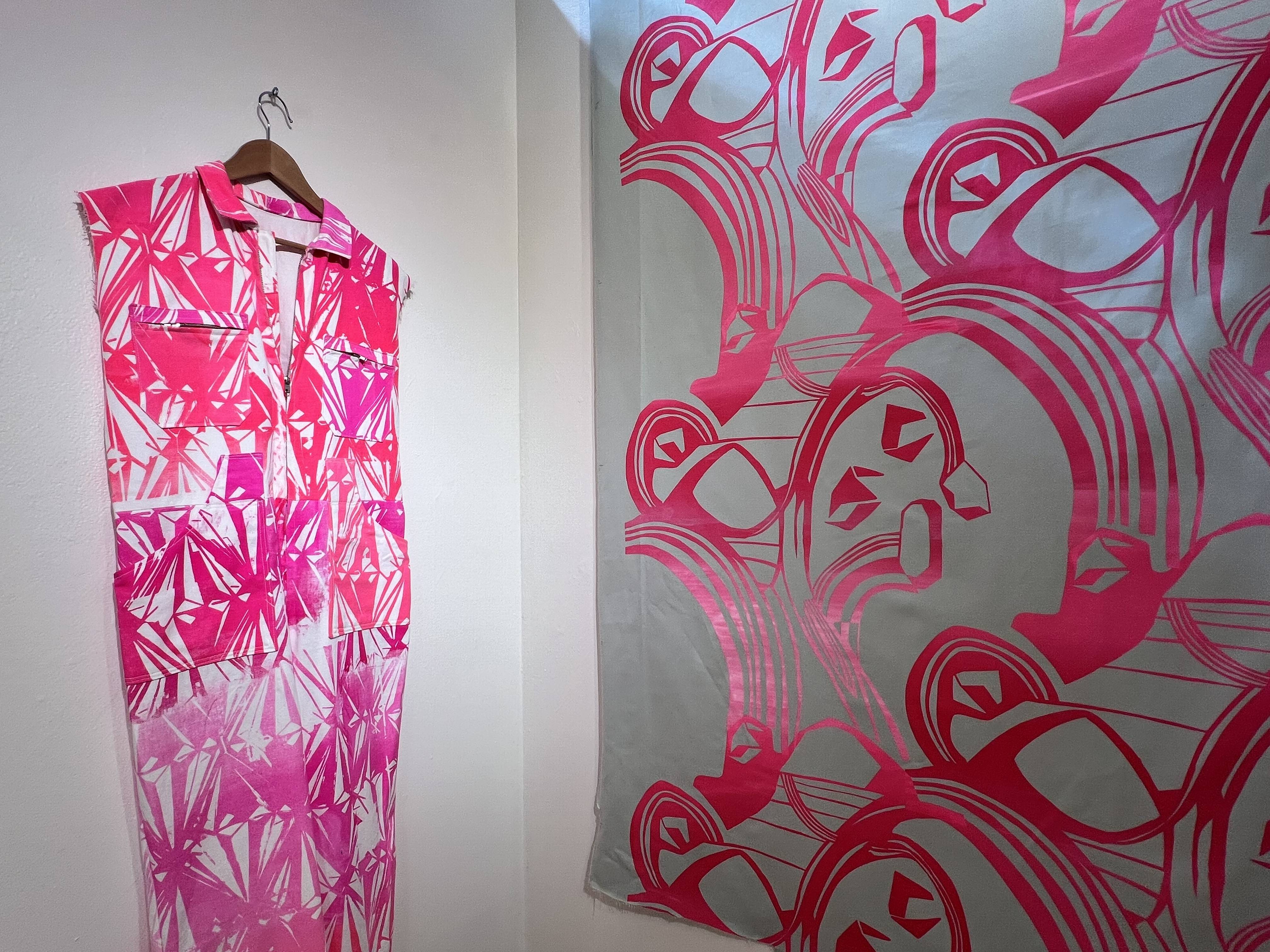 Henderson is a consummate craftsperson. Looking carefully at the handmade books on view, visitors will find works that are expertly constructed with a keen sense for detail and quality. A bespoke jumpsuit printed in fluorescent pink bears the marks of a skilled tailor, a talent Henderson says she initially picked up from her grandmother and later improved in classes at the West Side Sewing Studio. The artist’s books and textiles alike feature perfect stitches.