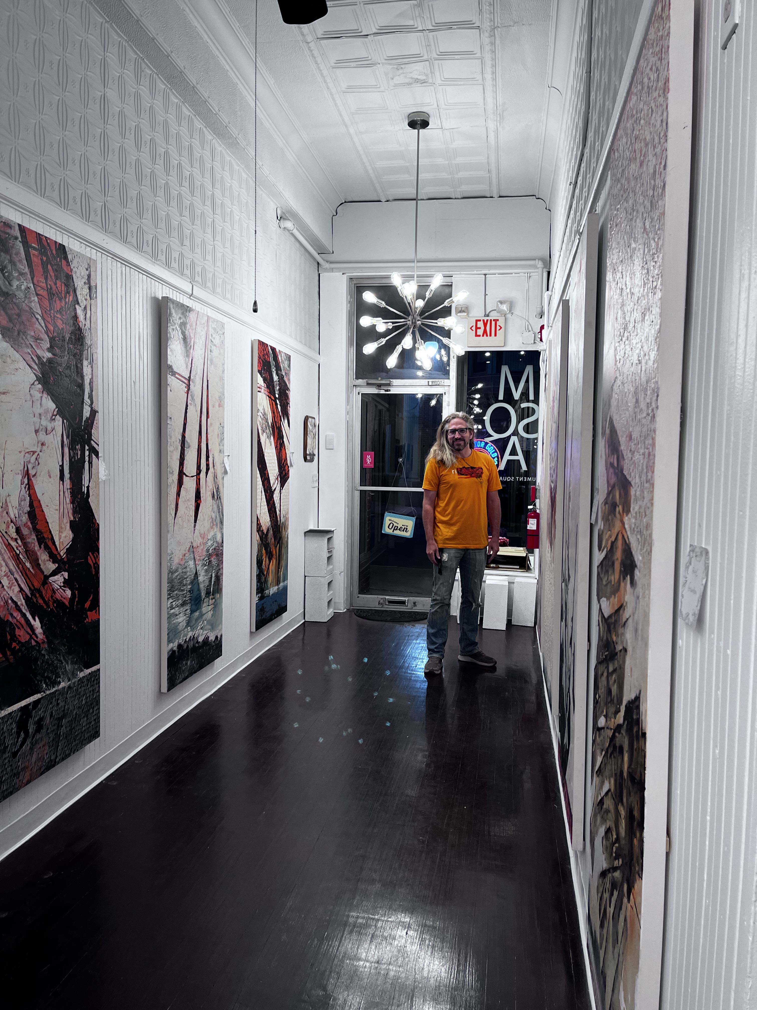 One of the recurring motifs in Morris’ work is the inclusion of text alongside swaths of abstract color and texture. For his show in Woonsocket, he has even covered the gallery’s front window in text. When asked about this element of his practice, Morris replies, “I use textual components in my work as a link between the tangible and the intangible, similar to a legend on a map or a key that opens the door connecting two spaces. It creates a covenant with my audience and an undertone of unspoken understanding between what we can manipulate physically and mentally. It grounds my experience to a foundation from which I can grasp the connections that govern so much of the world around me.”