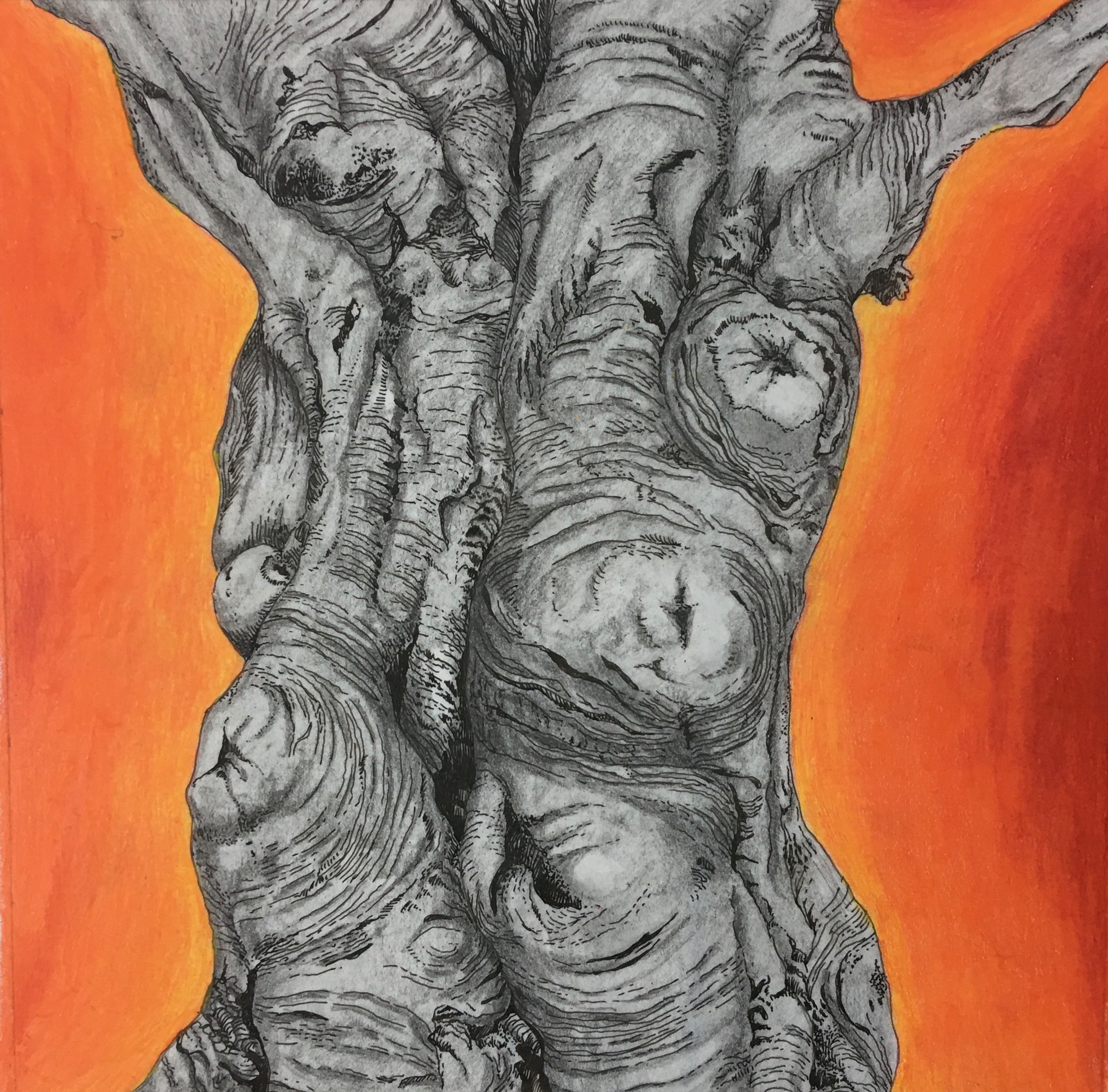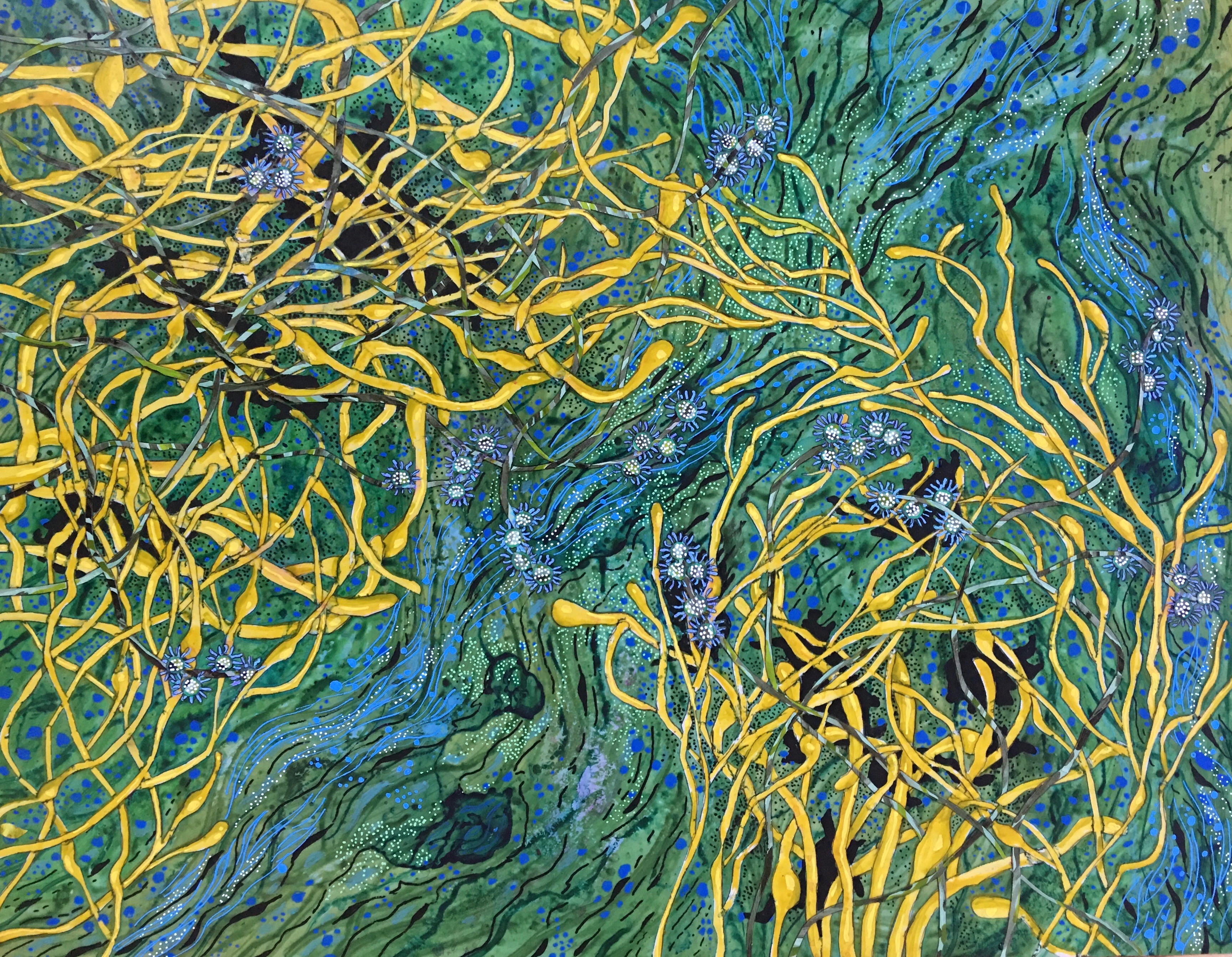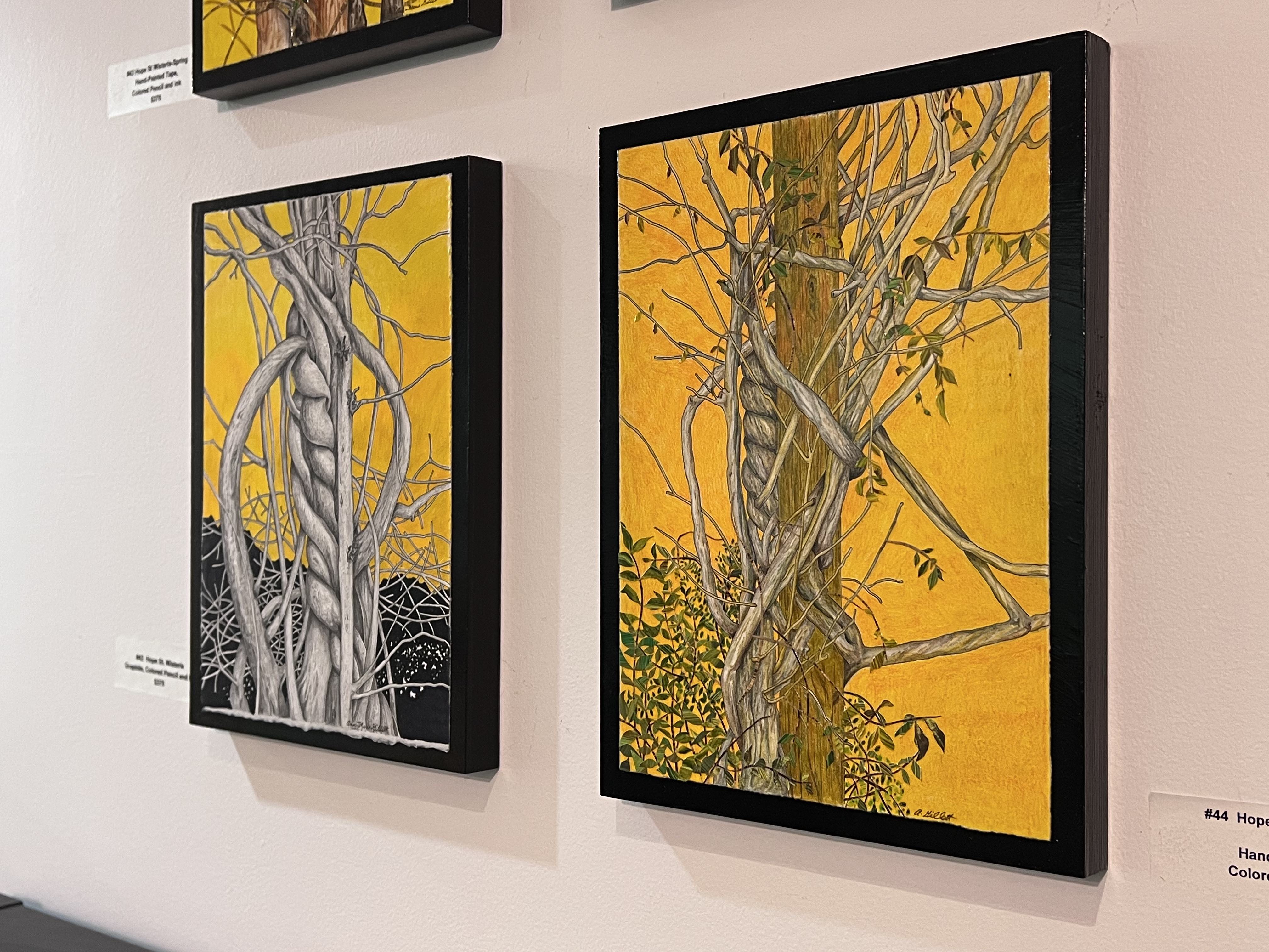 Gillett’s exhibition opens with a collection of bright images chronicling the life cycle of wisteria vines on Hope Street. The tangled and alien forms of wisteria are set against a shock of yellow in this quartet of images presented on panels. Combining elements of drawing and collage, this series is part scientific illustration and part abstraction. Gillett’s tendency for keen observation can be found in these works and in all the artworks on view.