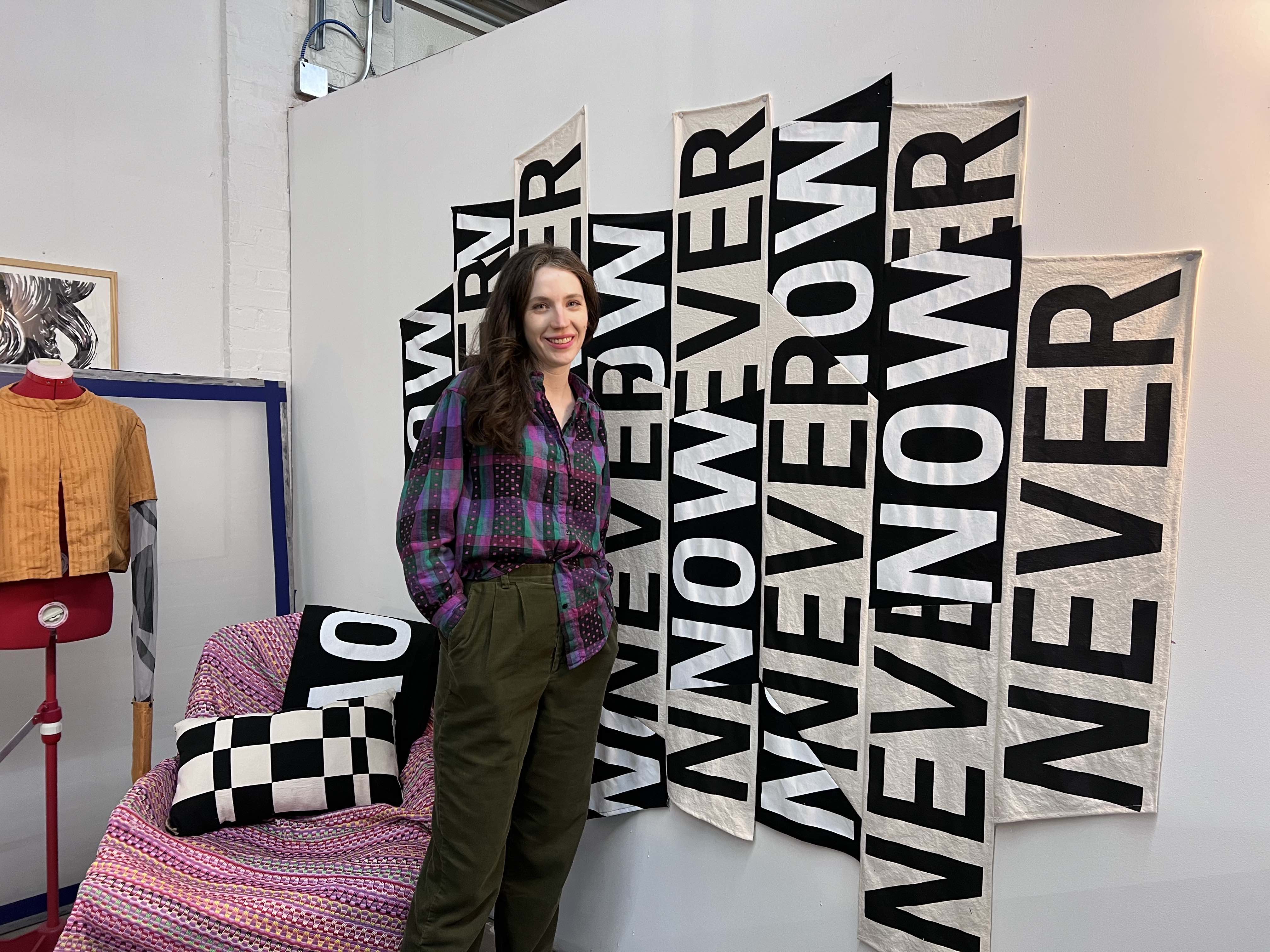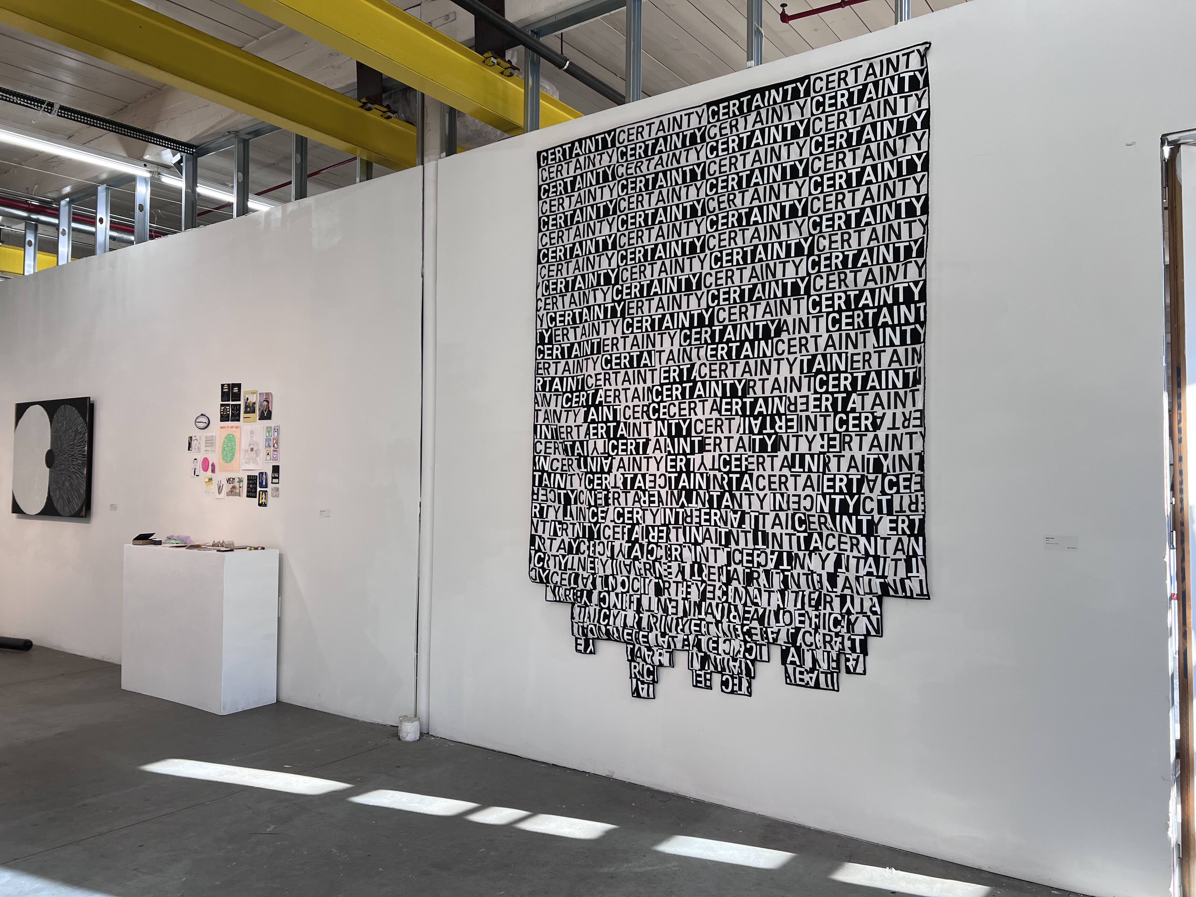 Text is another major component of McNeary’s recent work. In one finished piece in her studio at The Wurks, she blends the words “Now” and “Never”, while in another on display in The Wurks large industrial gallery space, she allows for the word “Certainty” to dissolve in a visual cascade.