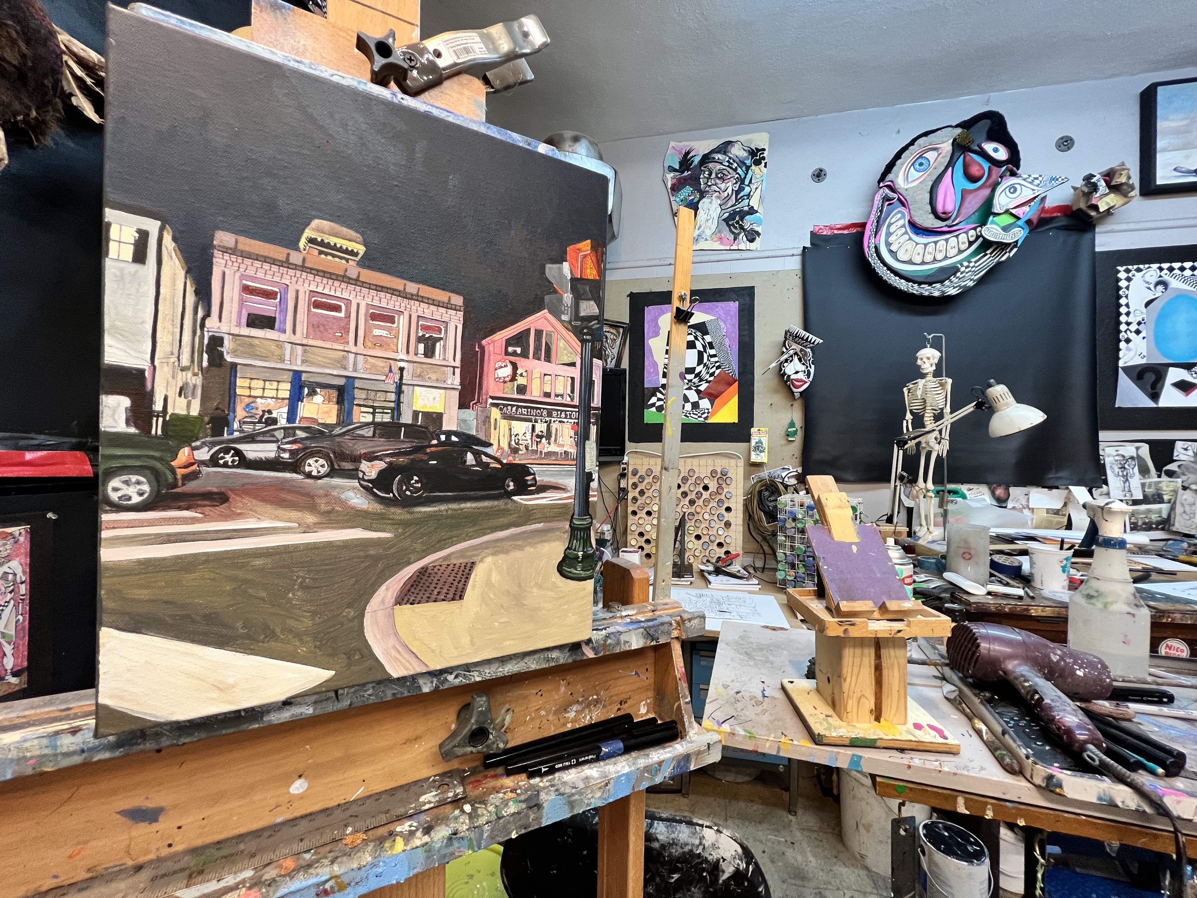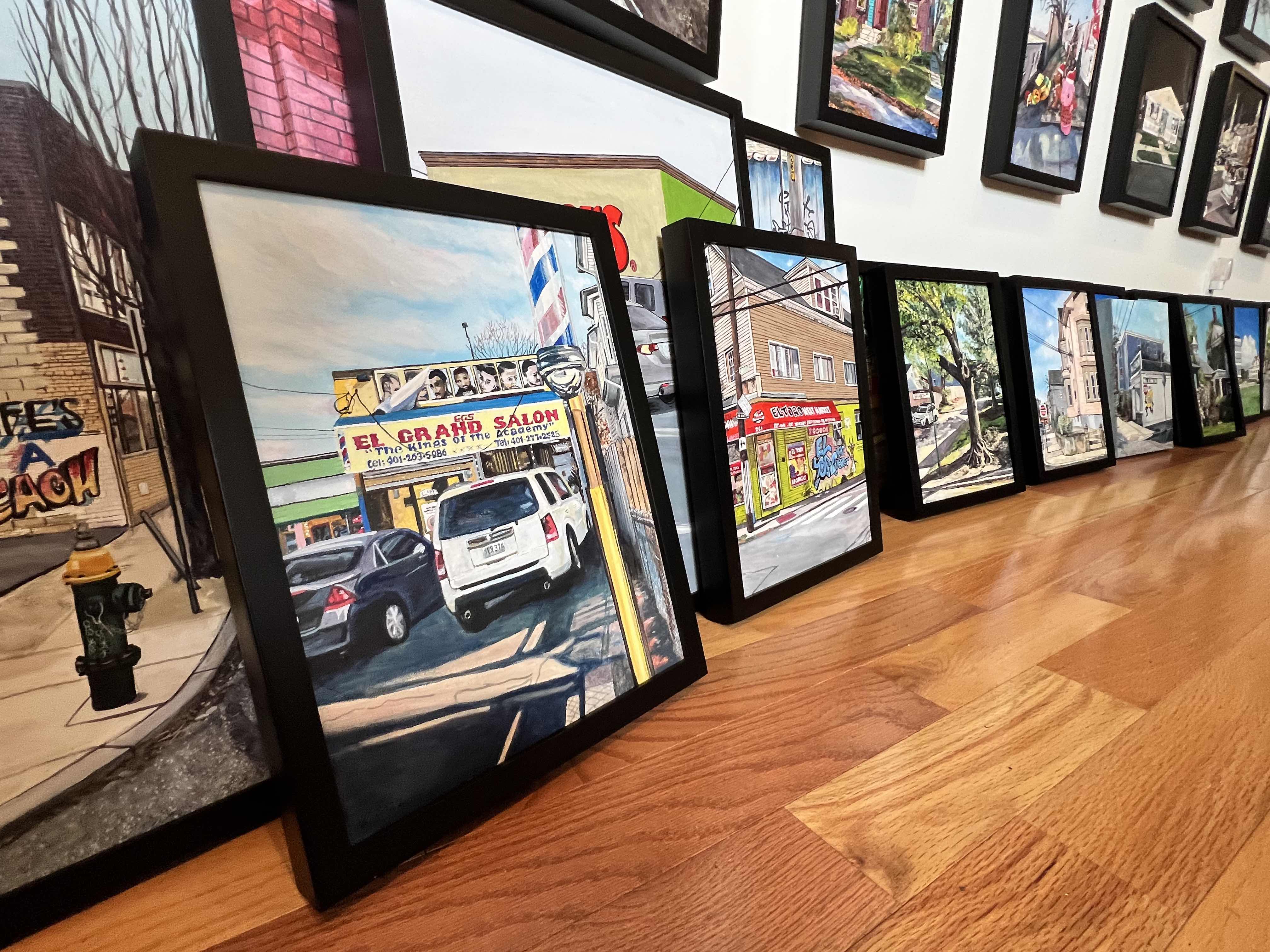 Crenca produces his paintings by walking the city’s streets and exploring its diverse neighborhoods. Landmarks recognizable to residents from all areas of Providence show up in Crenca’s art and his process involves taking himself out of the work in order to allow viewers to really see and explore the streetscapes he paints. Snapping hundreds of photos and looking closely on his own, he returns to his studio to transform canvases into poignant reflections on place. What emerges is a broad image of innumerable interwoven local stories set against the backdrop of the corner store, the construction site, the alleyway.