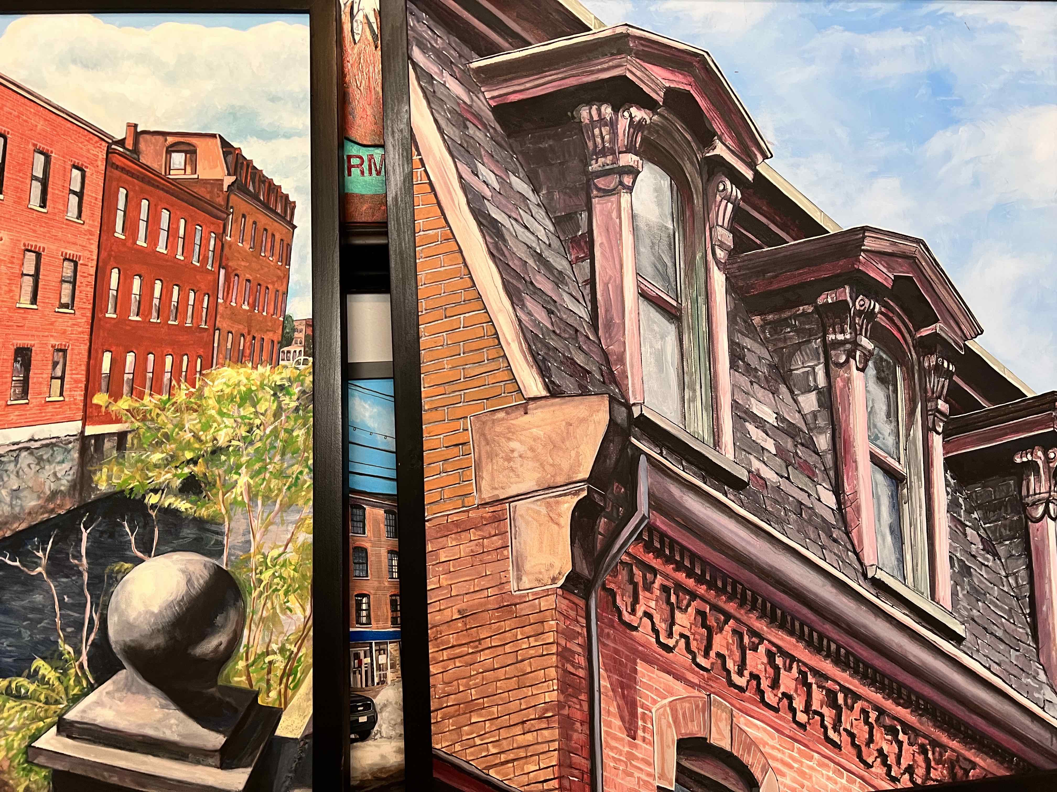 For Crenca, the city is his muse. His interest in its buildings, streets, and people has inspired dozens of finely detailed paintings. Describing the place that appears in all of the artworks that will be in his WaterFire show, he says, “What inspires me about Providence is the diversity of its people, neighborhoods, and architecture. The architecture speaks to a working-class industrial past, a history of immigration and migration. The story of my family.”