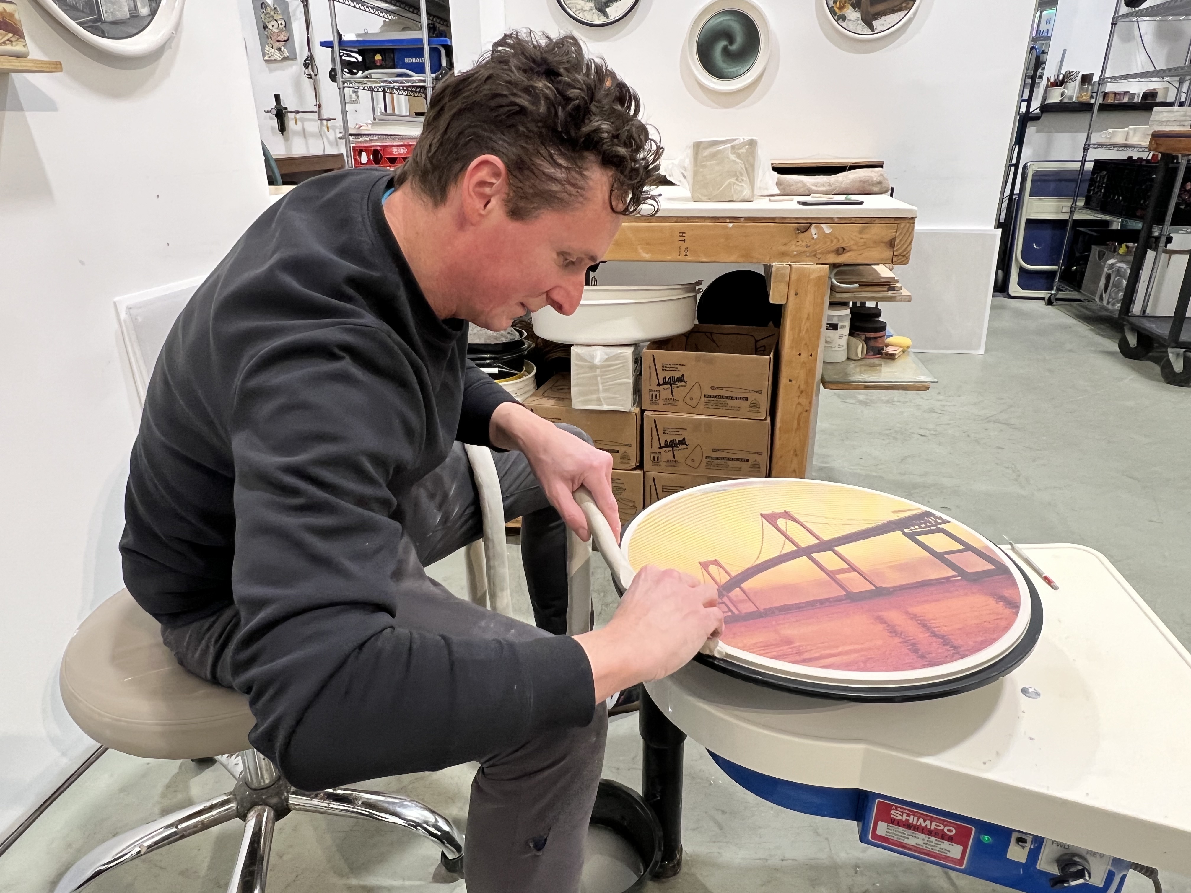 On a recent afternoon visit, Allyn was at work on a new ceramic platter that bears an image of the Pell Bridge lit up with warm, multilayered tones. He had already silkscreened the image onto the wet clay base and in facile movements, he skillfully added a clay rim to the form while discussing his process and passion. With an exacto knife and a steady hand, he then trimmed away excess and prepared to shape the smoothed and damp surface into a refined curl that will frame the image within.