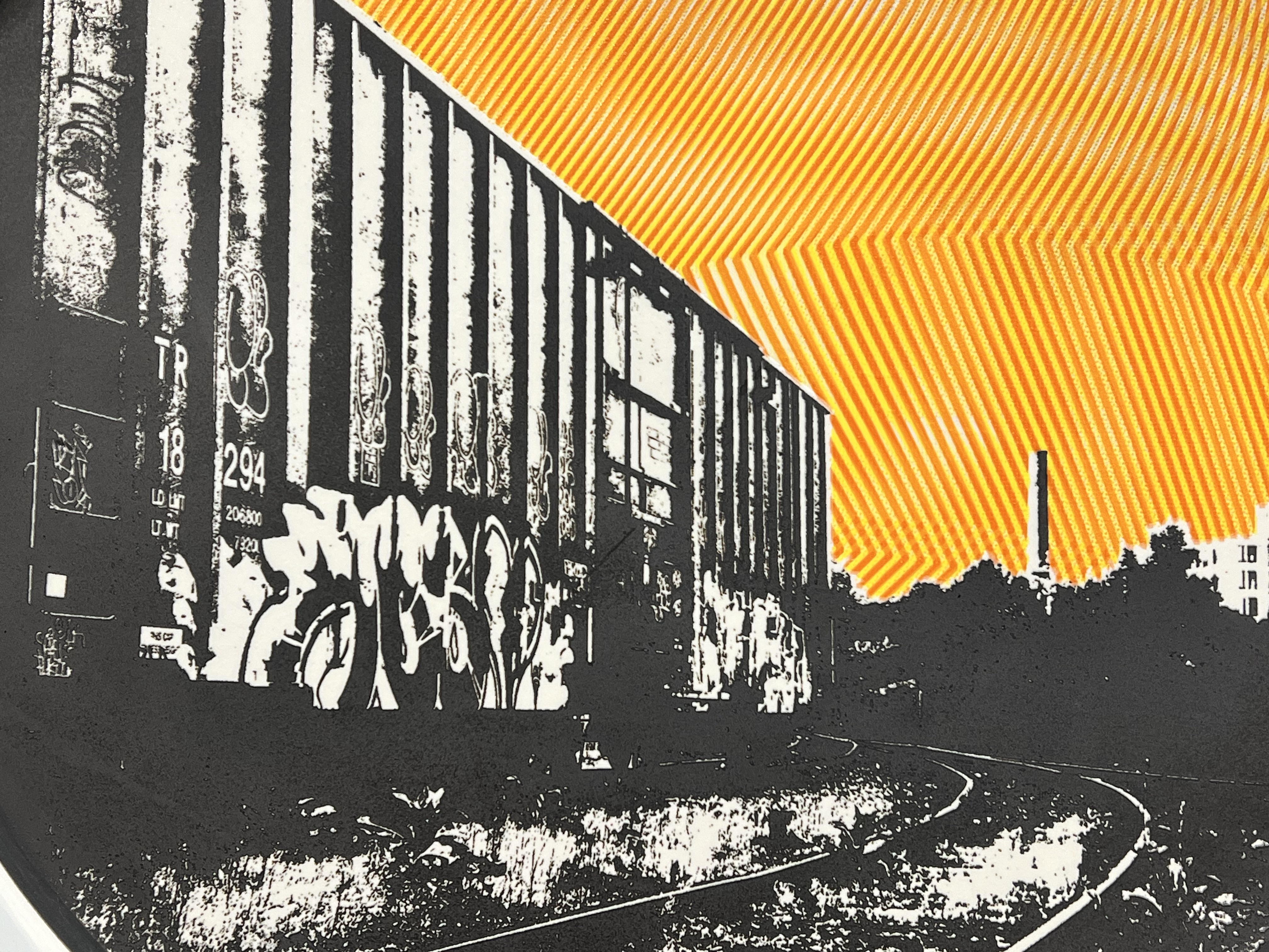 Allyn’s work starts with his love of cycling, which carries him to locations around the state. He takes photographs of architecture, landscapes, places that Rhode Islanders might find familiar and that he finds compelling. He then uses Photoshop to color separate his images and creates multiple silkscreens that he uses to apply the images to his ceramics. This technique ranges from small images or abstract patterns on cups and vases to large-scale explorations that show up on platter-like forms that can be laid flat or installed on a wall.