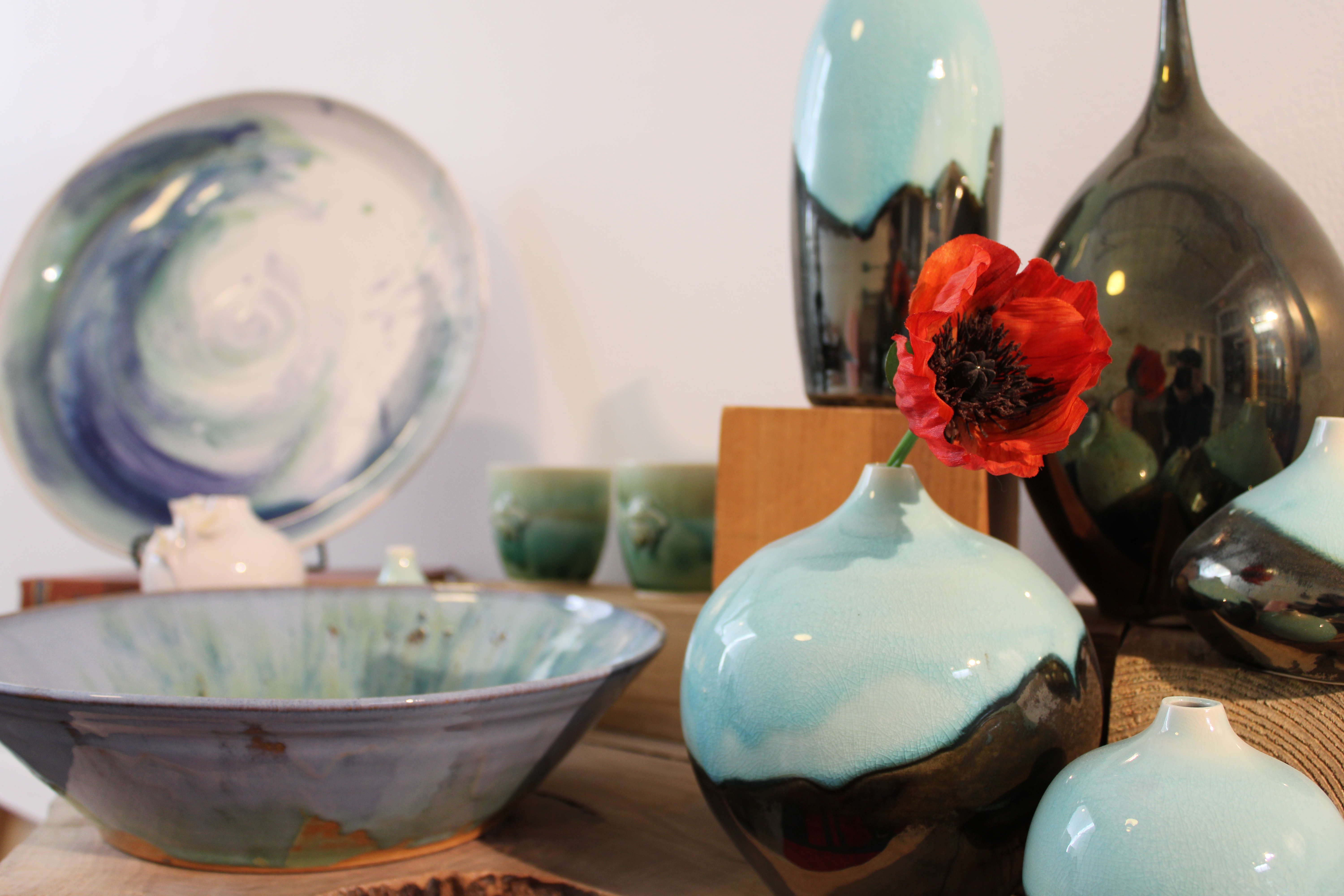 Handmade bowls, plates, and other useful domestic objects once populated the tables of every household. While most now stock their homes with mass-produced items, the appeal of the handcrafted is enhanced in a contemporary world saturated with technology. Select artists are leading the charge to bring beautiful hand-formed pieces into households. One such individual is the talented Hilal Minda, who operates New Moon Ceramics at her studio in Pawtucket’s Hope Artiste Village. Minda’s ceramic works bring organic forms, lustrous surfaces, and vivid colors to the homes of her collectors, enlivening everyday lives in the process.
