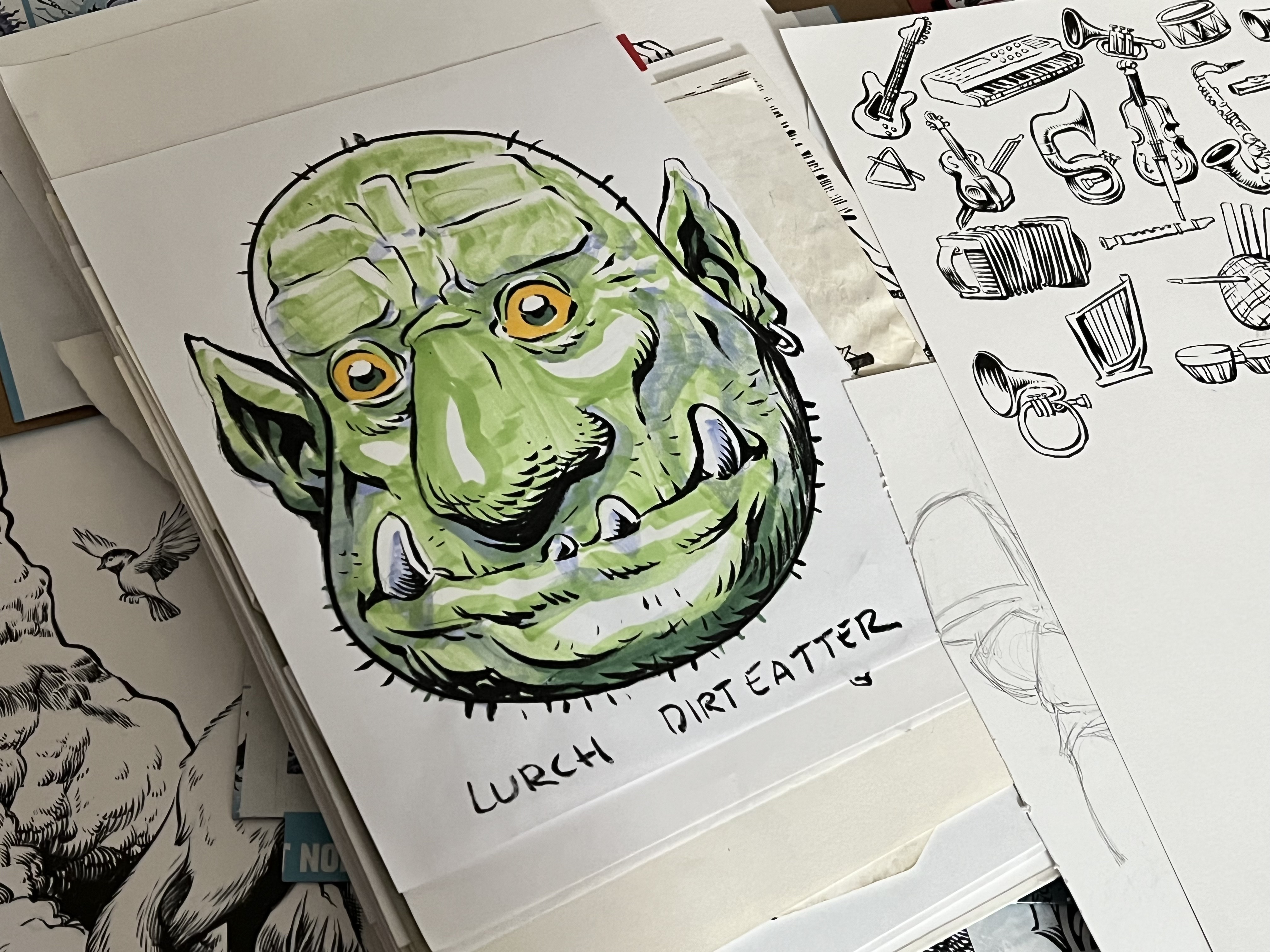 Asked about his process and where concepts originate, Nolan says, “Each idea comes from one of two places, either a client has commissioned me to draw their idea, or I'm pulling from my imagination. Most start with one or more sketches, and from there develop a larger drawing with brush and ink, which I'll color digitally.”