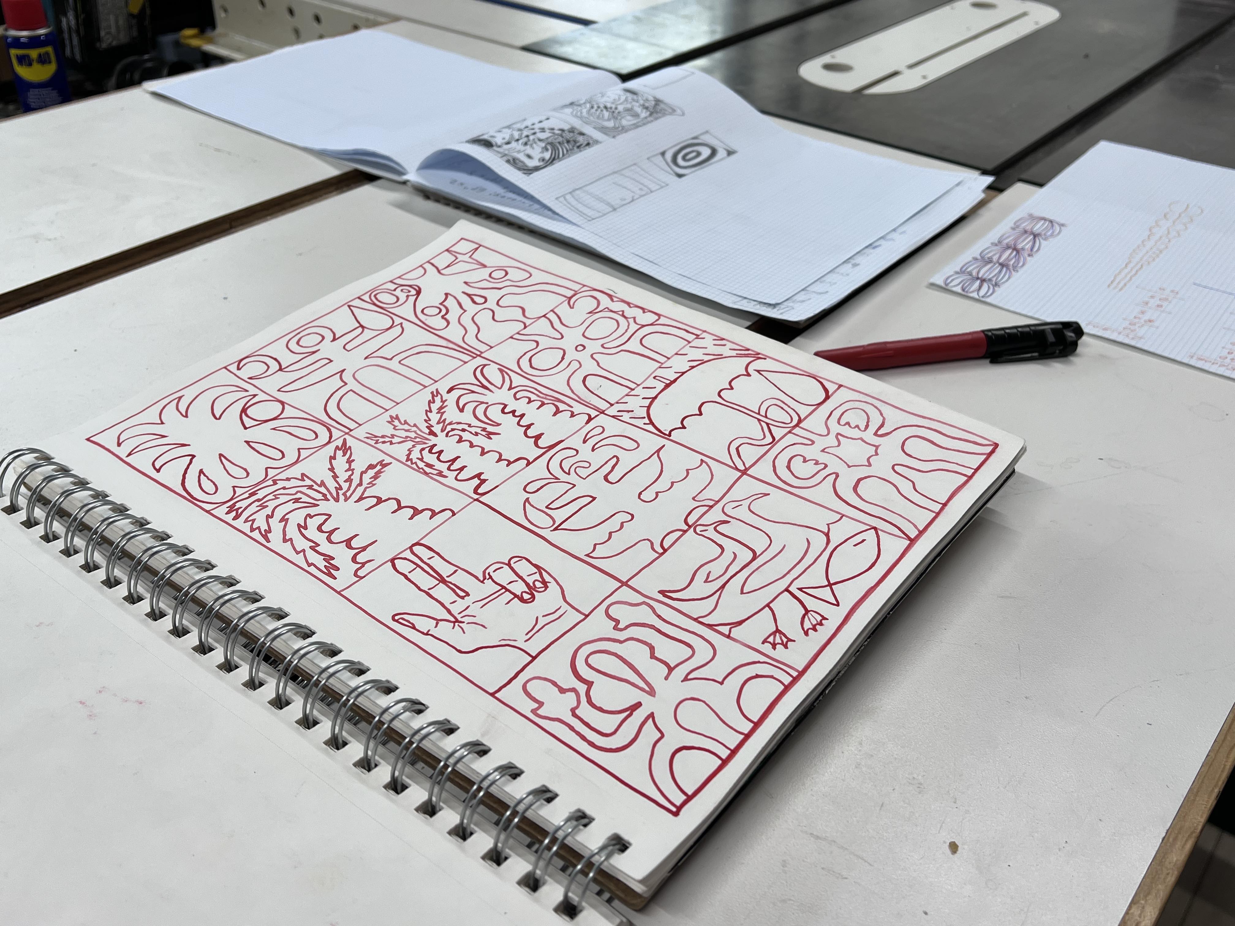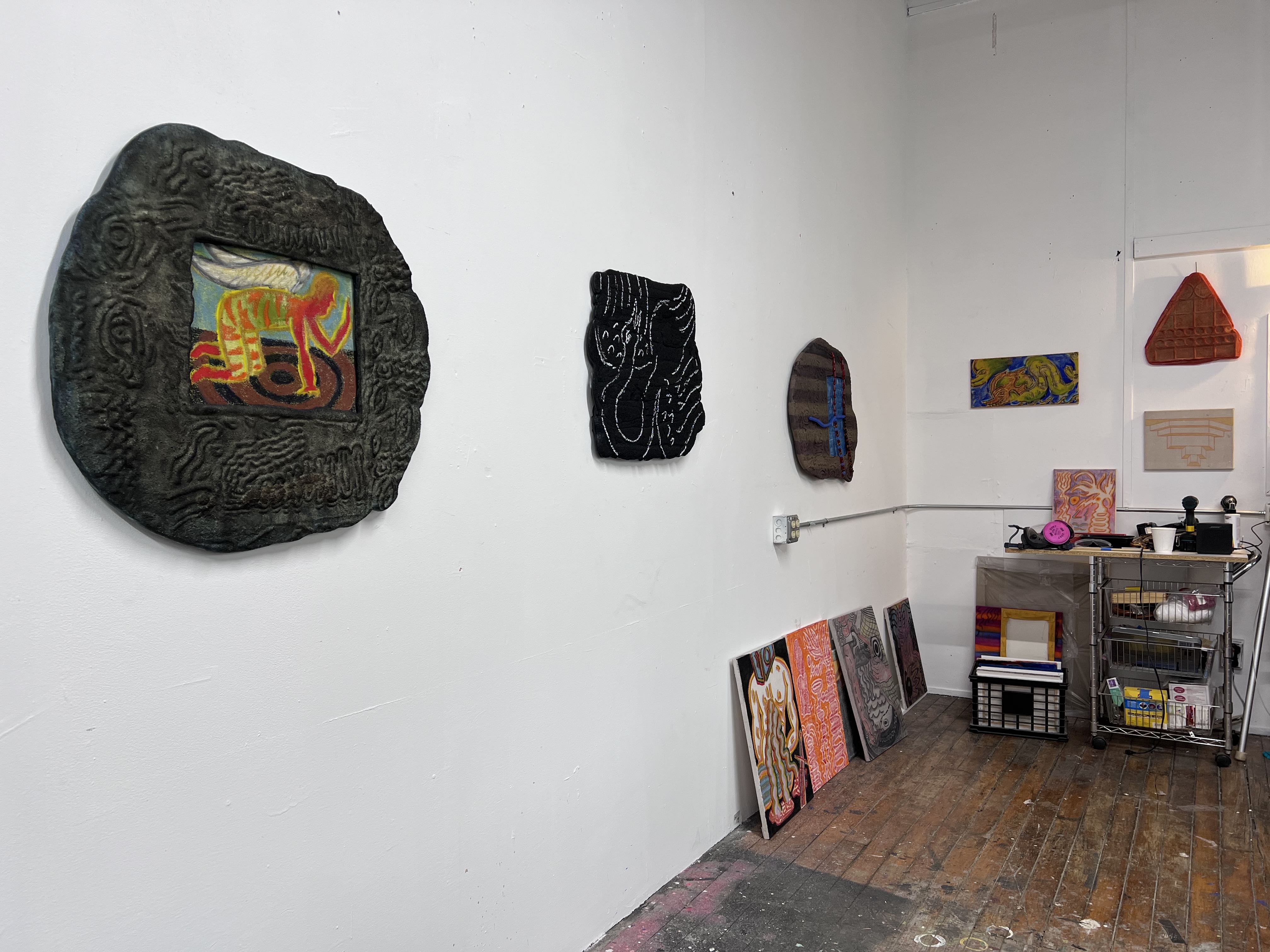 MacMillan’s own workspace is located in a former industrial building, tapping into the type of environment where his forebears in the state might have worked. Housed in a gritty brick factory not far from the Providence-Cranston line, MacMillan’s studio space boasts high ceilings and tall walls, perfect for making and mounting artworks. During a recent visit, new works created using foam, sand, and acrylic paint were on display. On the opposite side of the room, MacMillan’s work station includes tables used for painting and saws used for woodworking, a newer element of his creative practice.