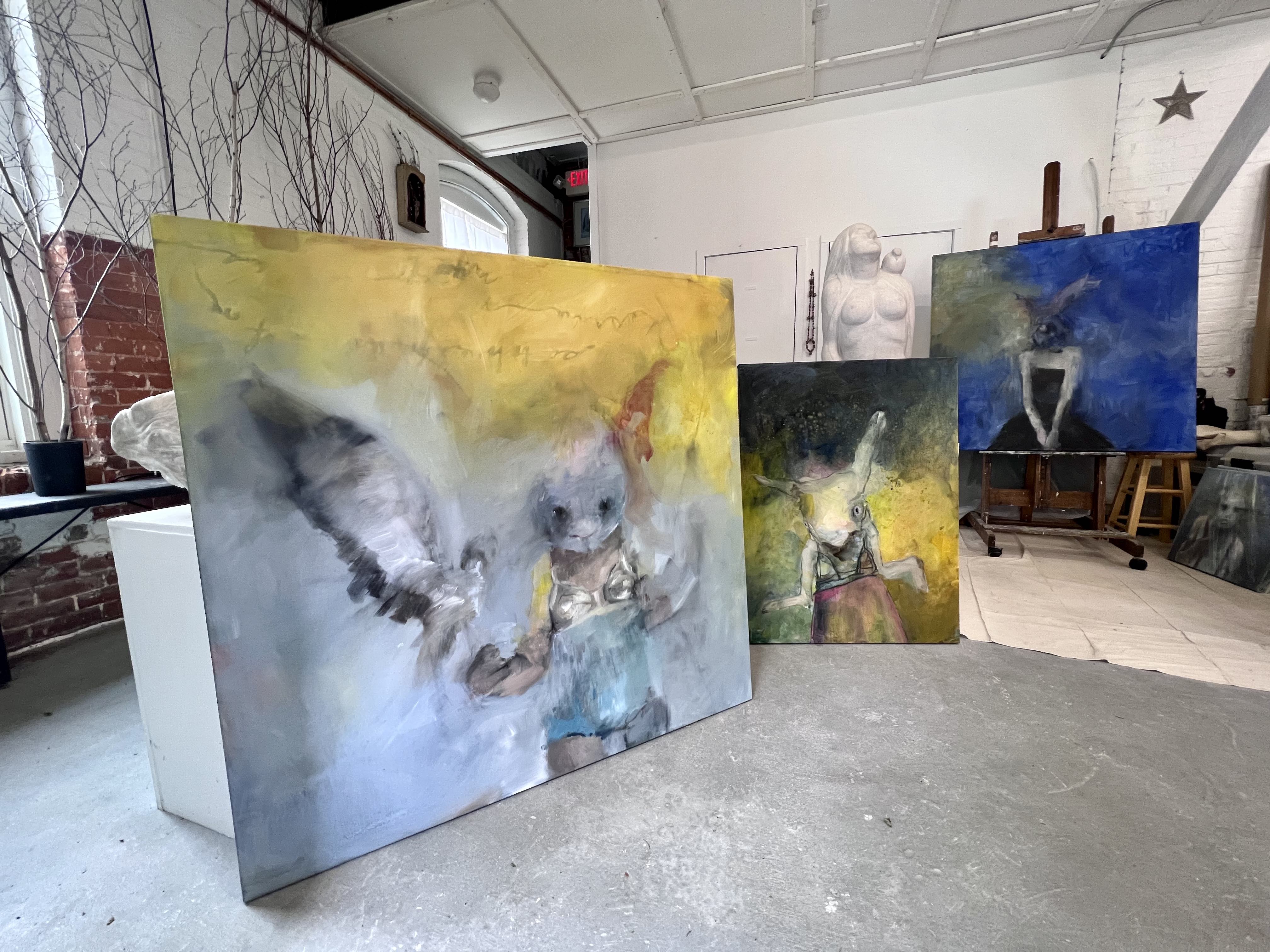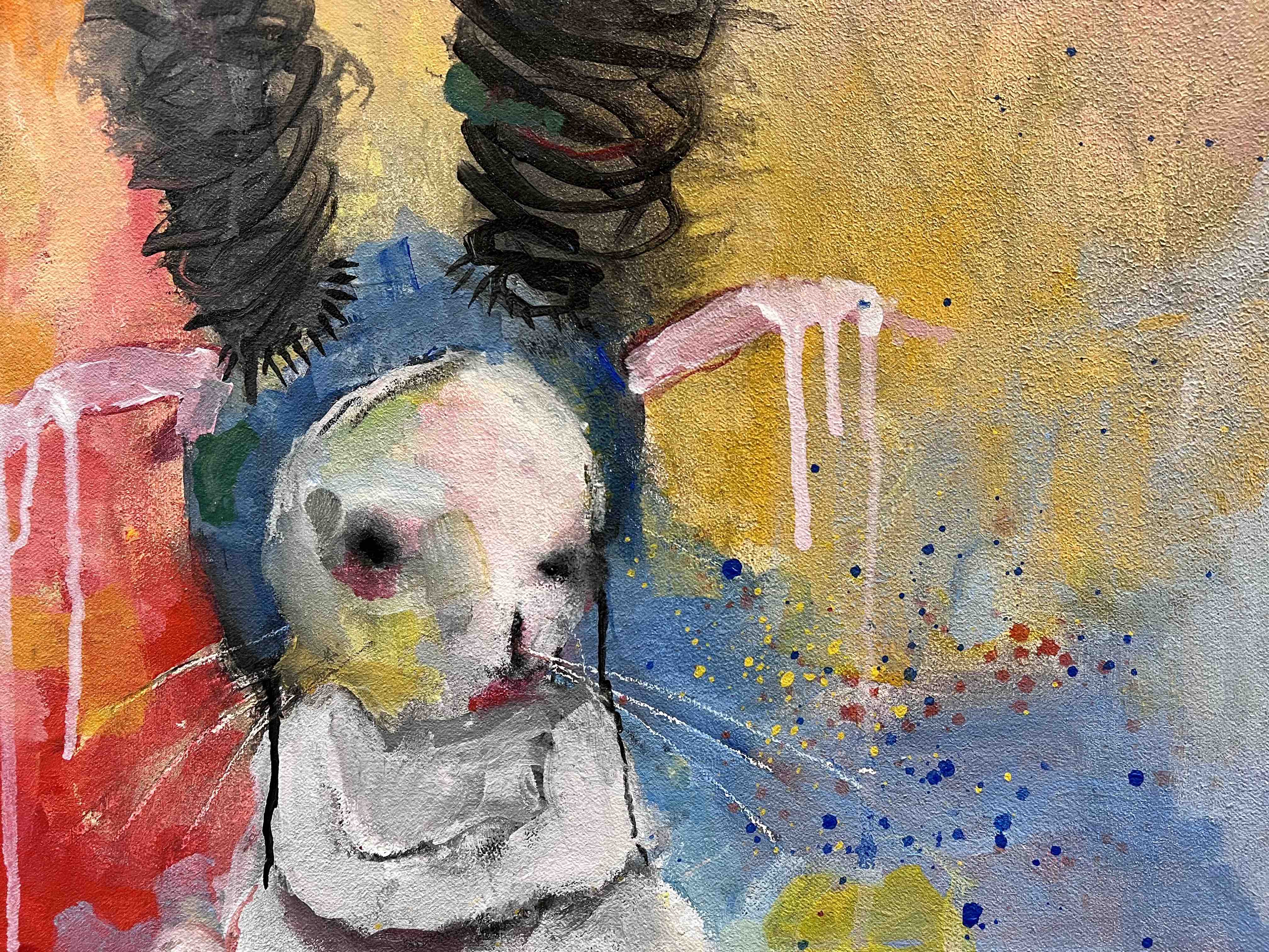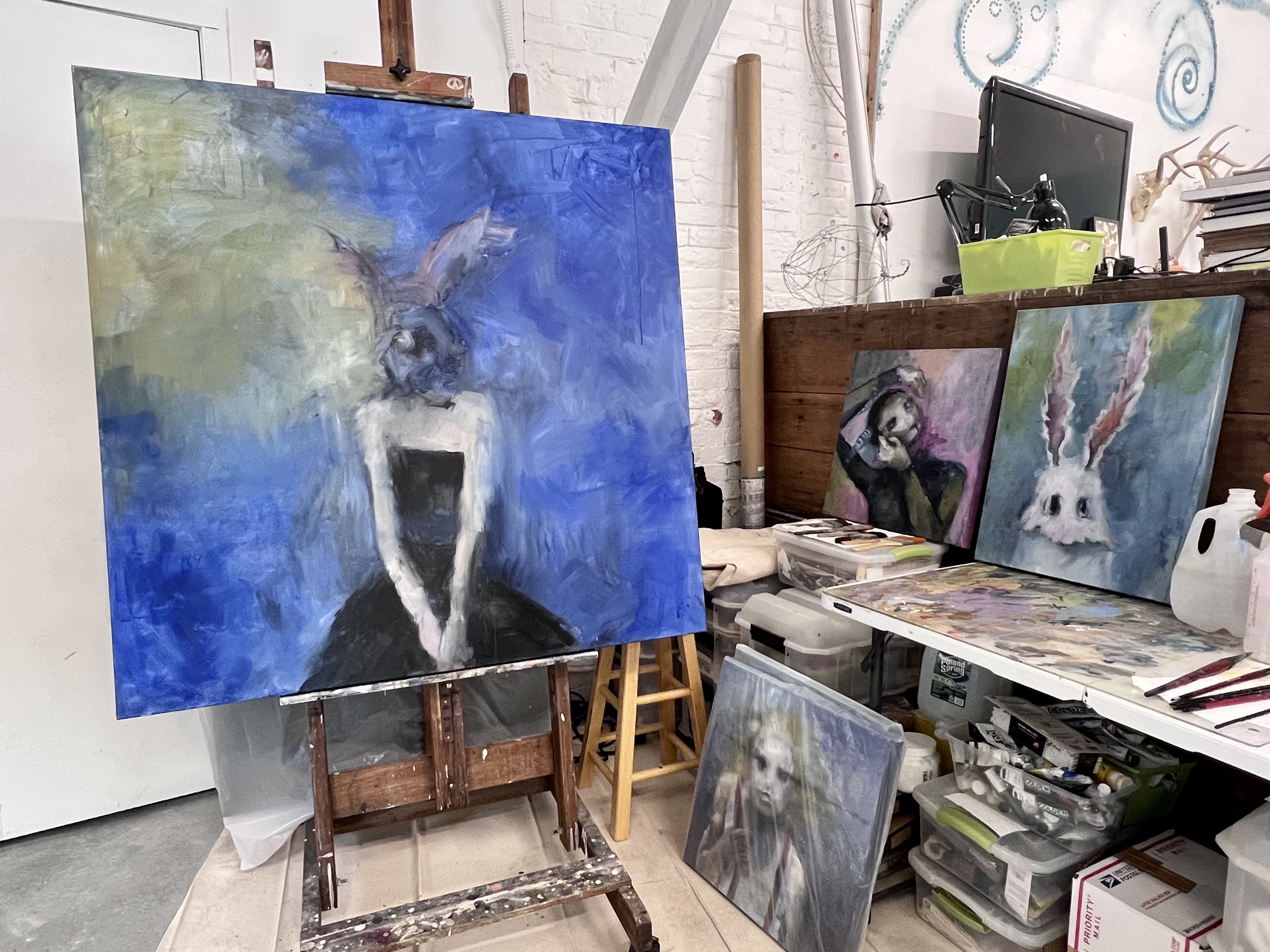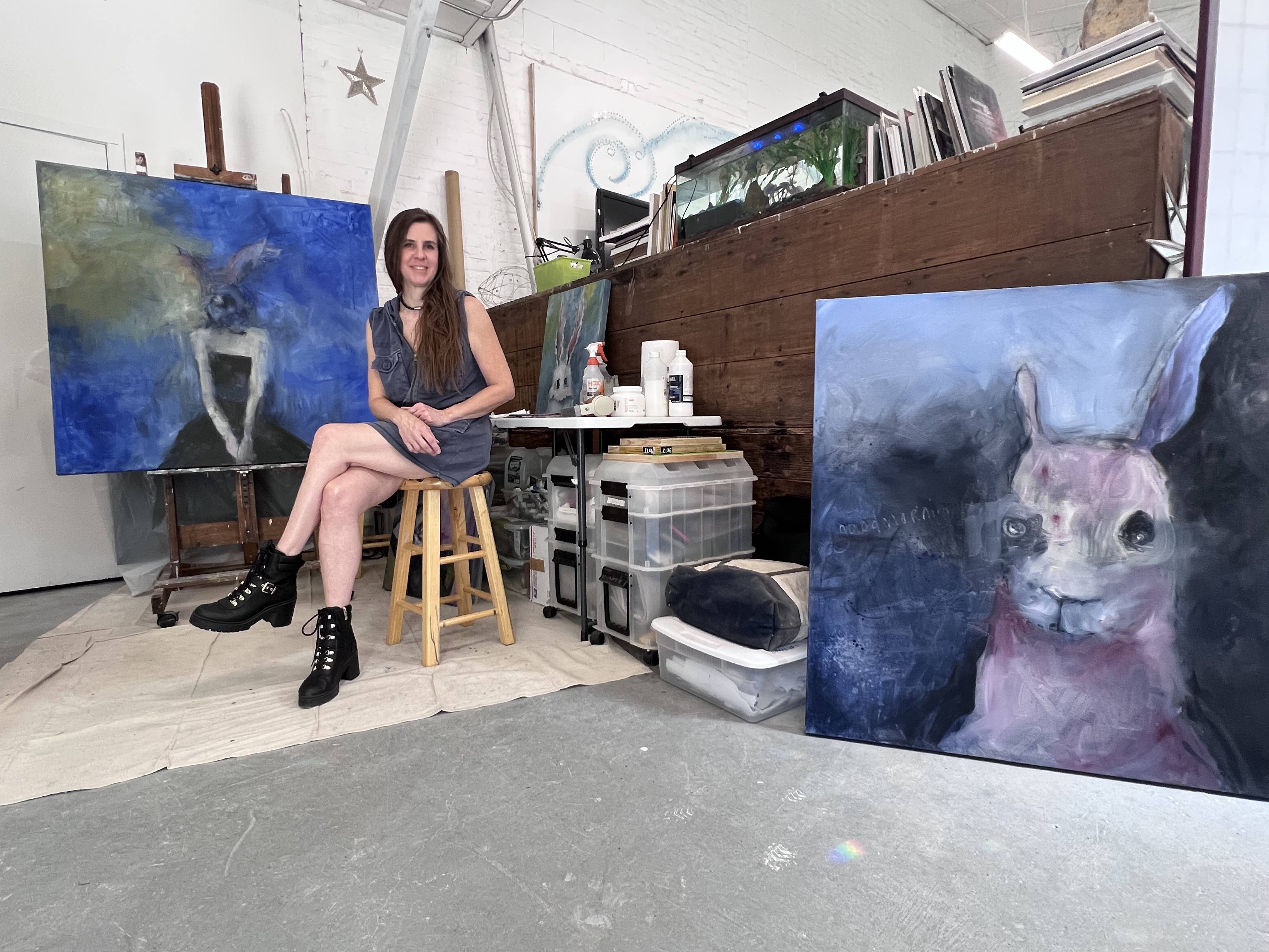 There are two current opportunities to experience Weschler’s singular artistic point of view. Her artworks are the focus of a solo show at BankRI Gallery at One Turks Head Place in Providence through September 6, 2023. The show, which is open Monday through Thursday from 9 am - 4 pm and Fridays from 9 am - 5 pm, features a selection of Weschler’s brushy and immersive paintings. Weschler makes art using the moniker Sumo Bunni, and the rabbit motif appears in much of her work.