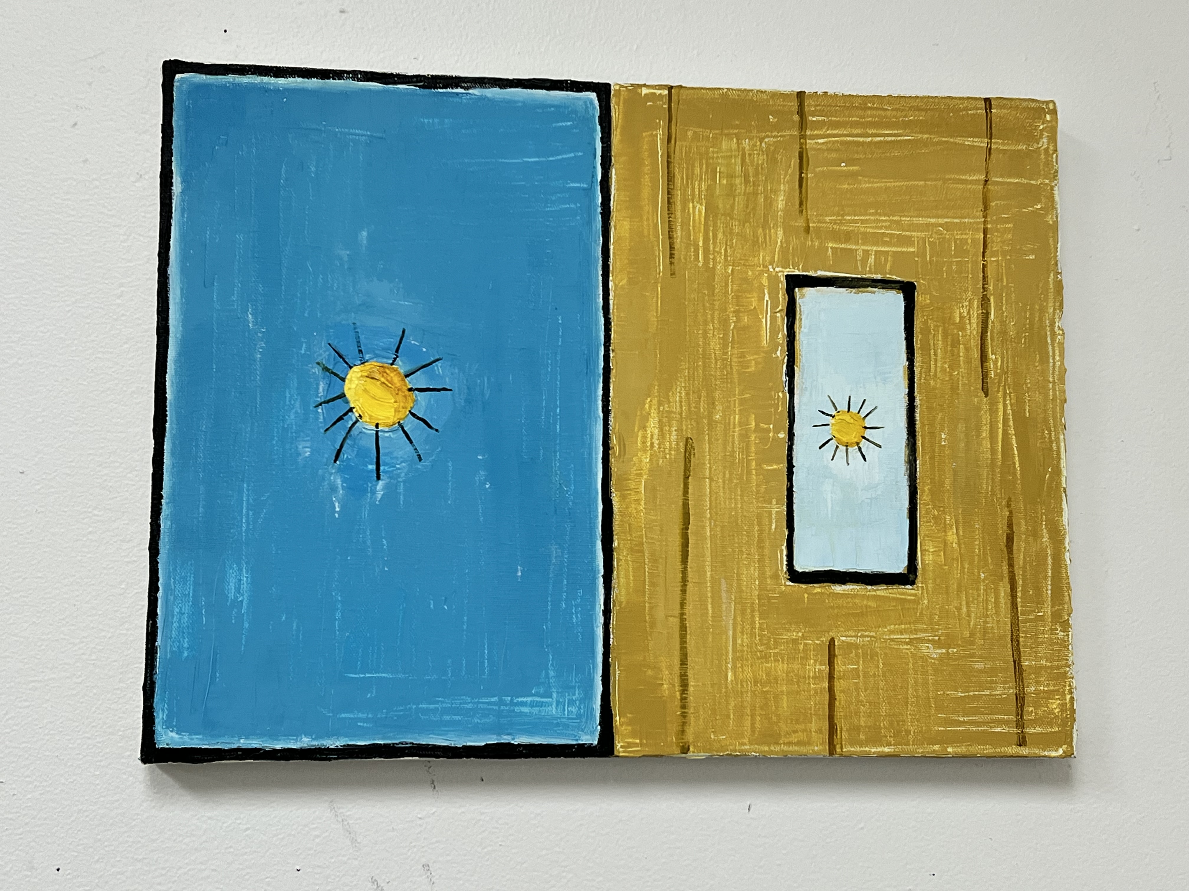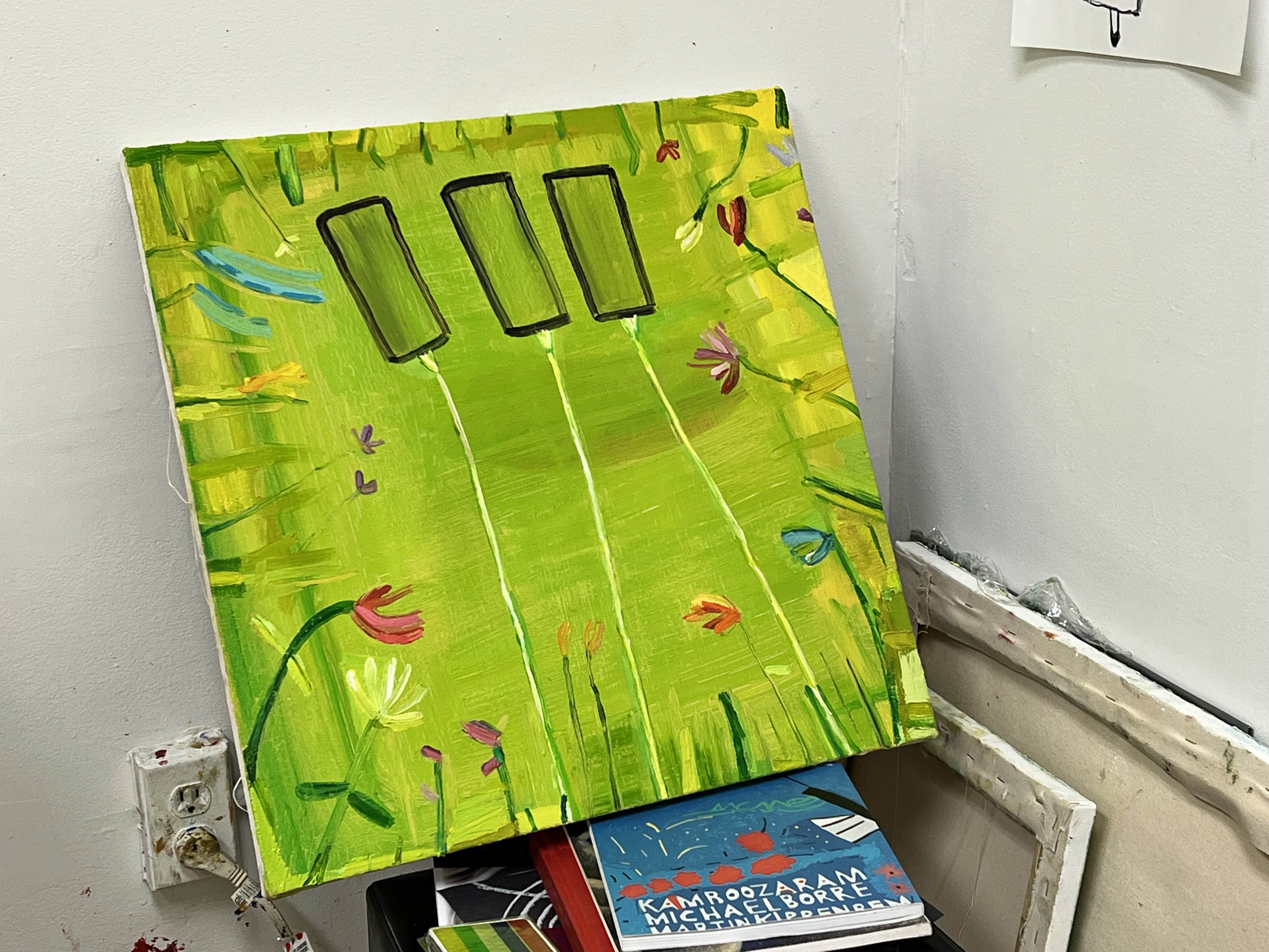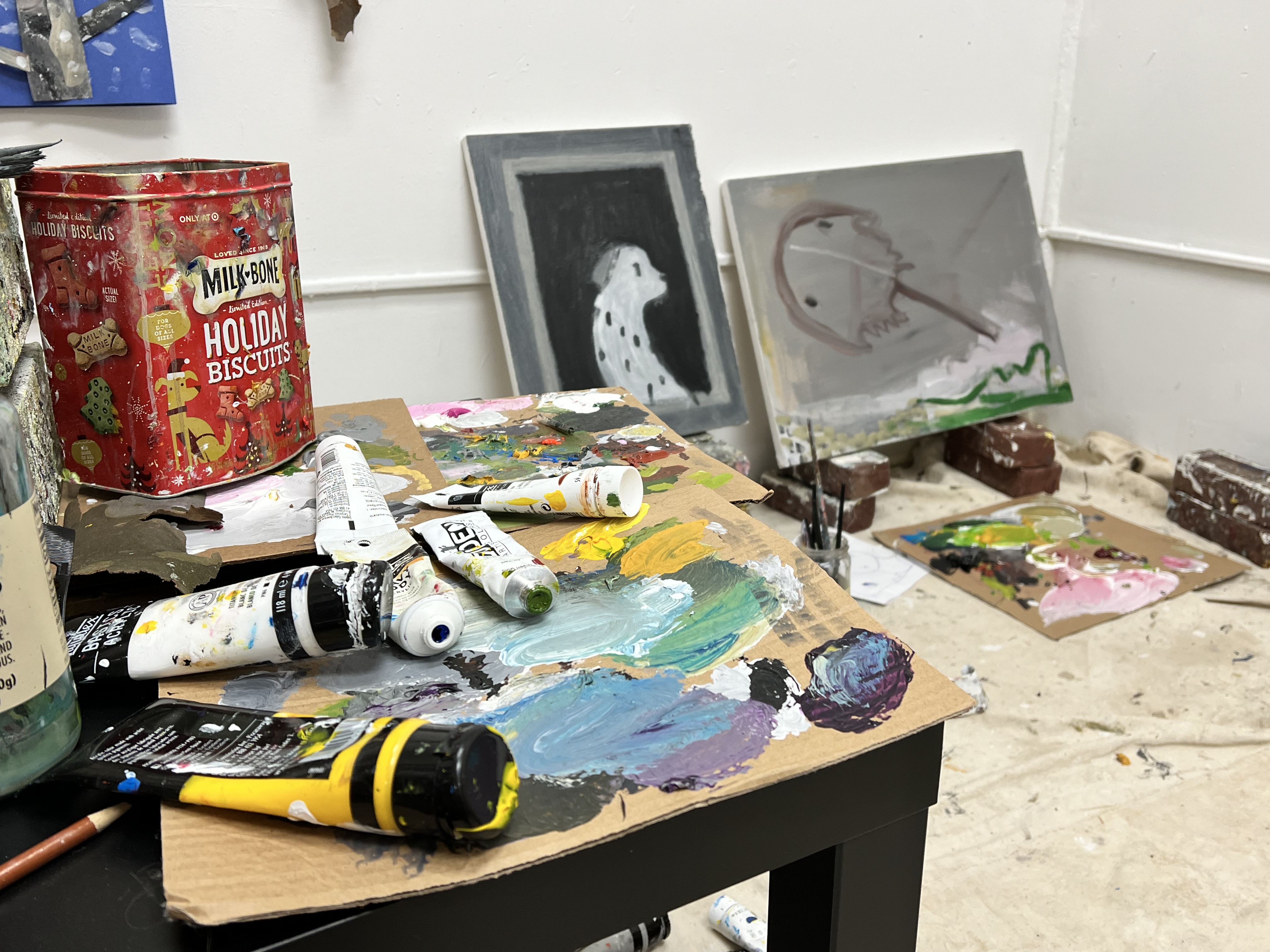 The land appears in a number of DeAngelis’ current paintings, as do animals, or abstracted forms of recognizable objects like cell phones. In her studio, she also has drawings in crayon alongside experimental collages. She sometimes works directly on the floor, and might also include dirt or sand in her paint to increase the texture and impact of its appearance.