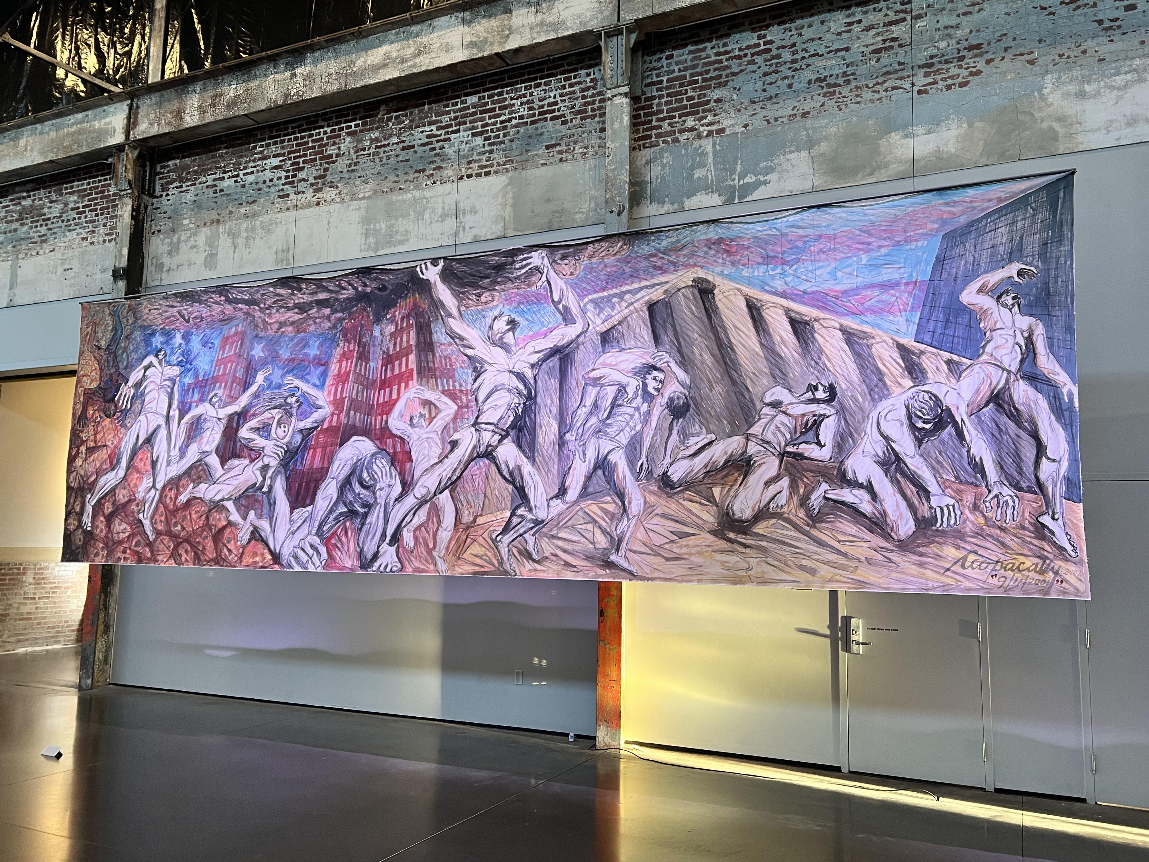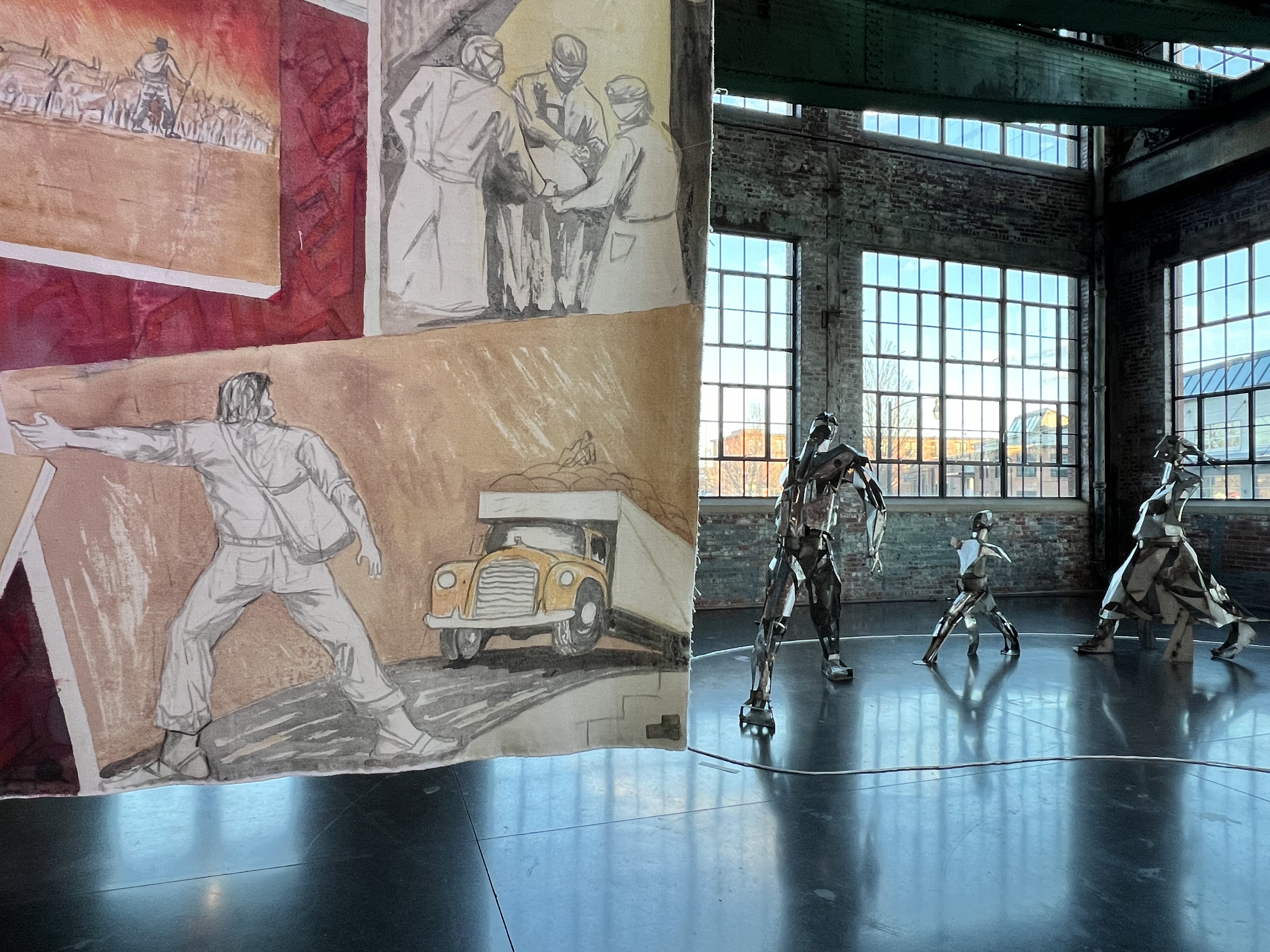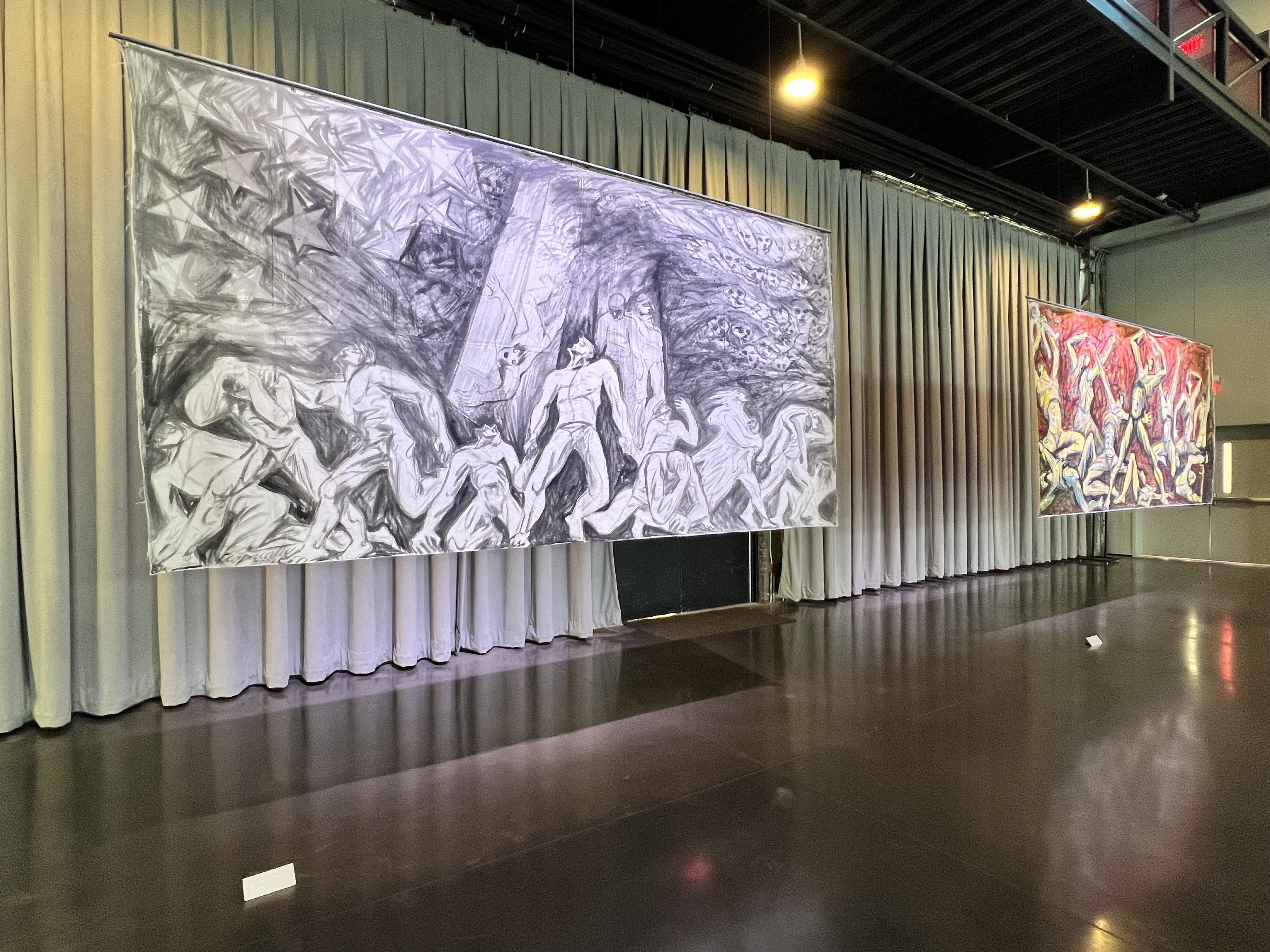 The murals on view are impressively scaled and are installed on wires away from the walls so that they sway gently as guests pass by them, making for a kind of passive interaction that is unusual in highly controlled exhibition spaces. Covering challenging subject matter, the human form is central to the compositions and Ccopacatty renders his figures in a way that is grand, expressive, and muscular. The pieces in the show exemplify the artists’ experience creating public artworks in various settings around the country and locally. He has collaborated with organizations like The Avenue Concept multiple times to put art with meaning in public spaces.