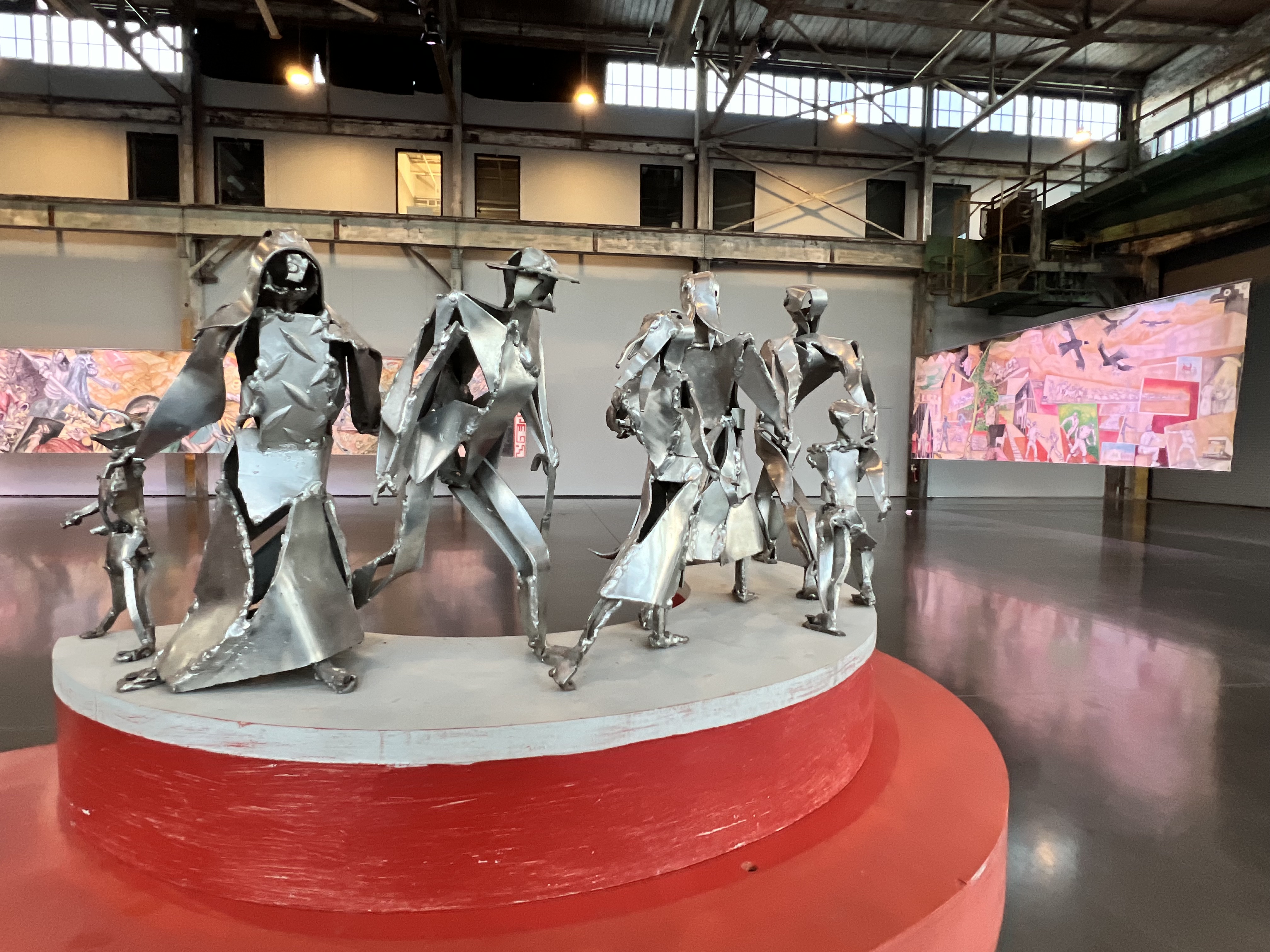 Ccopacatty’s murals are almost cinematic in their scope. Visitors have to look up to appreciate them. They are immersive and thought-provoking. Alongside these pieces, a collection of larger-than-life-sized metal sculptures of human forms and an accompanying maquette is also on display. These add depth and interest to the solo show and allow visitors to see a different skillset of the muralist, one that requires a torch rather than a brush.