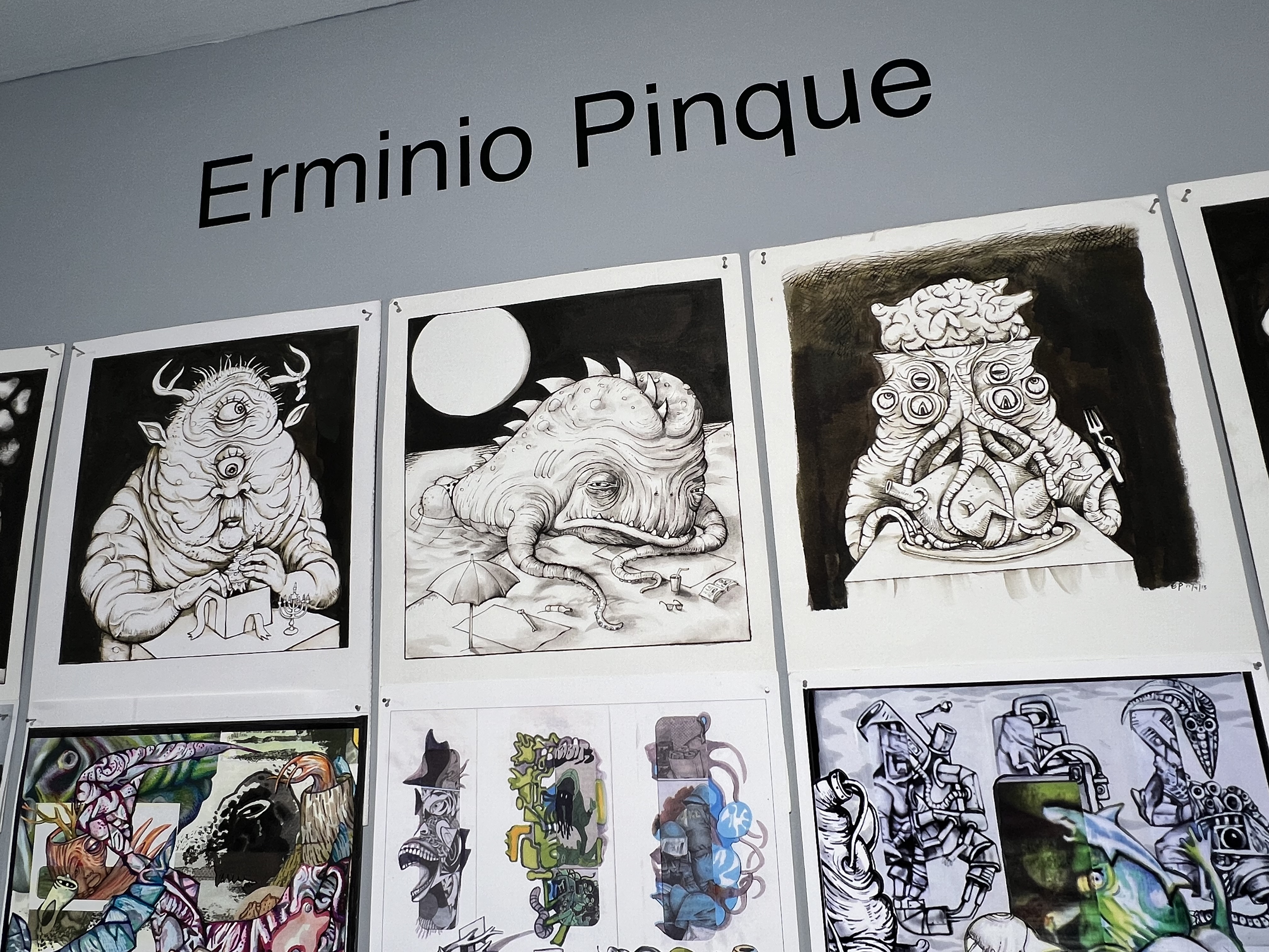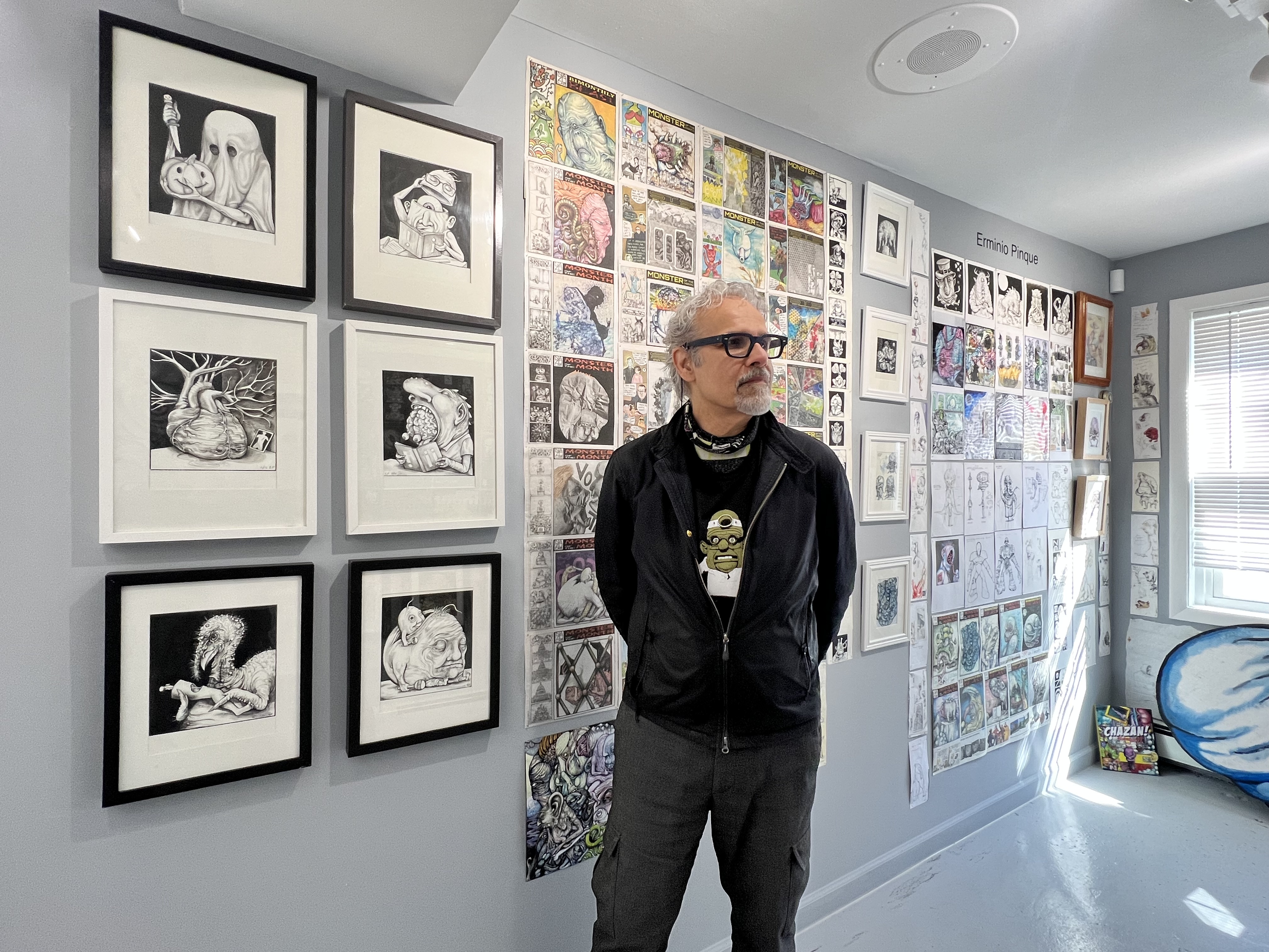 The immersive installation Pinque envisioned for this show exemplifies his maximalist sensibilities. Every surface is covered and every piece of paper is a potential canvas for his creativity. Repurposed envelopes from bills are the substrate for images doodled while he was on the phone. Comics and cartoons that he has published are pinned up as well. There are also original drawings for a graphic novel he produced for the late art patron Dr. Joseph Chazan about his career and collecting. Chazan and Pinque were longtime collaborators and the artist was the subject of one of NetWorks documentaries Chazan funded.