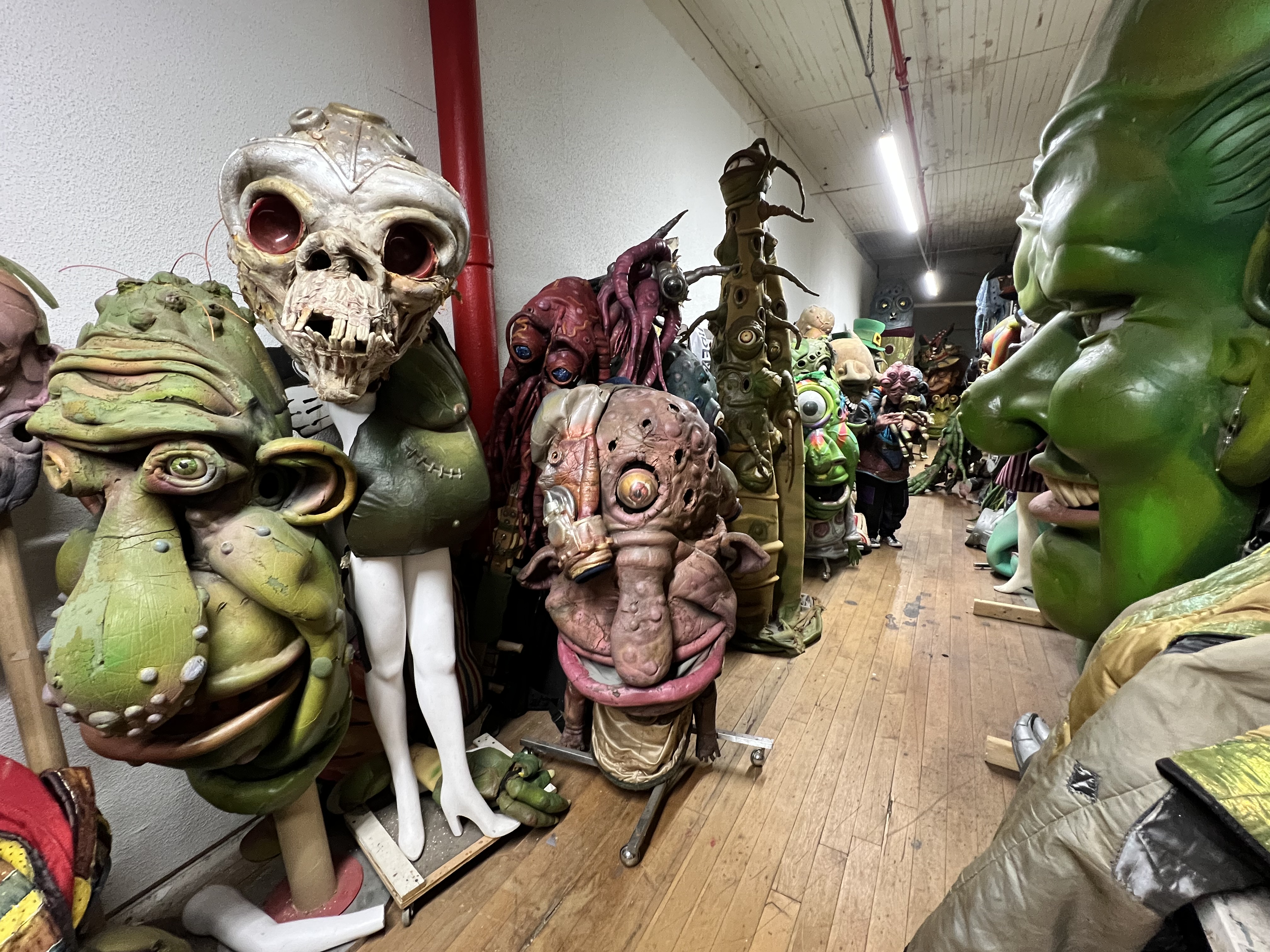 In multiple spaces at Atlantic Mills in Olneyville, Pinque and his collaborators conceive and build creatures out of foam, paint, and found objects. A hallway in the historic mill is lined with sculptural puppets designed to be worn by human actors. There are works that look like steampunk armor and others that evoke the extraterrestrial. Bulbous green noses and furrowed purple eyebrows that emerged from Pinque’s mind and pen can be seen in three dimensions. It is a showcase of Pinque’s lengthy career and his rich imagination. He recently hosted a MassArt class, with students coming from Boston to experience the spectacle.