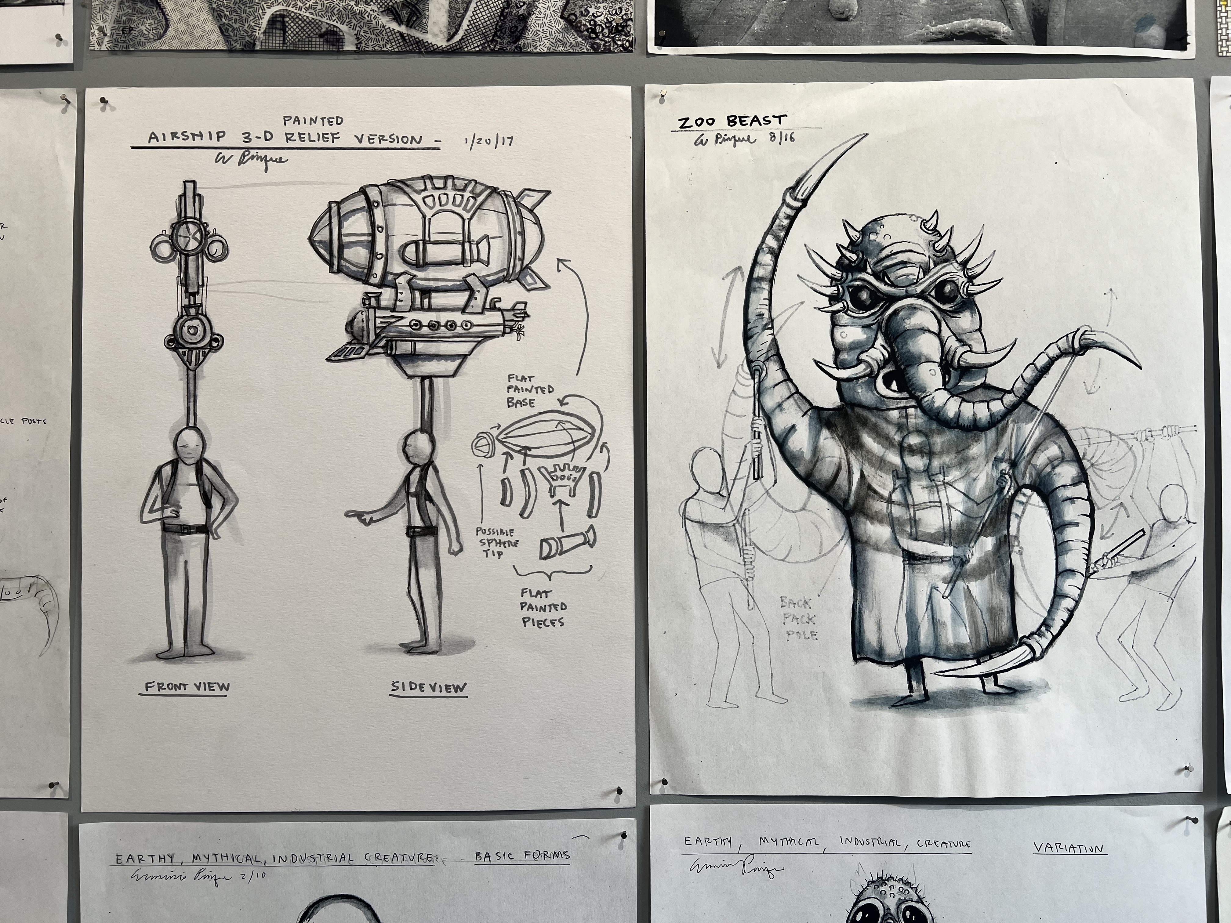 A RISD alum who originally majored in Illustration, Pinque attended the school at a time when exploration across departments was encouraged. He took courses in painting and sculpture and was able to study liberal arts at Brown as well. He has been a professional artist since the 1980s so making and performing are a way of life for him. His current exhibition at Angell Street Galleries shows off the illustrative skills that shaped the foundation for this remarkable practice as an artist and performer. The two disciplines are tied together, and he says he never draws any creature he could not render in a sculptural form.