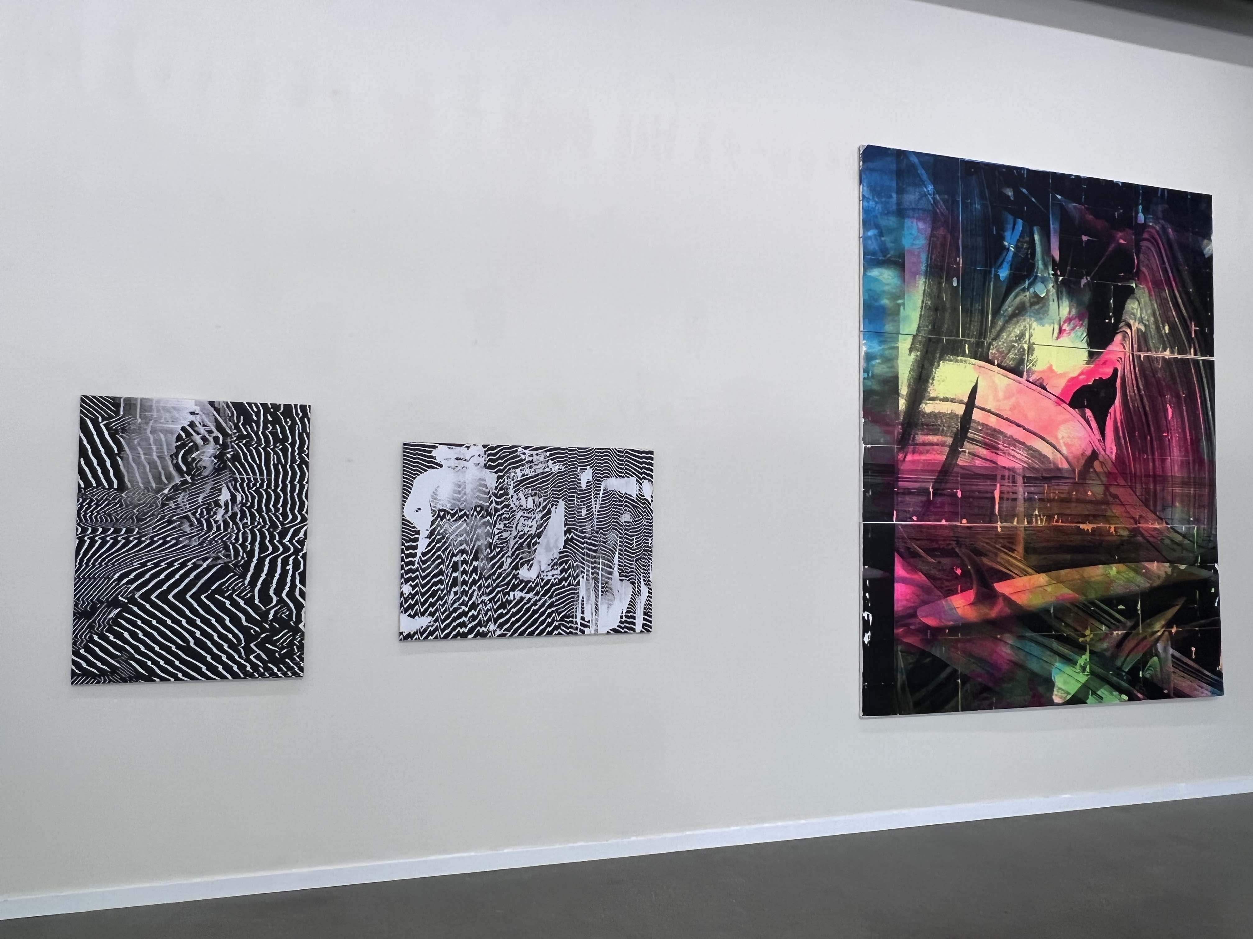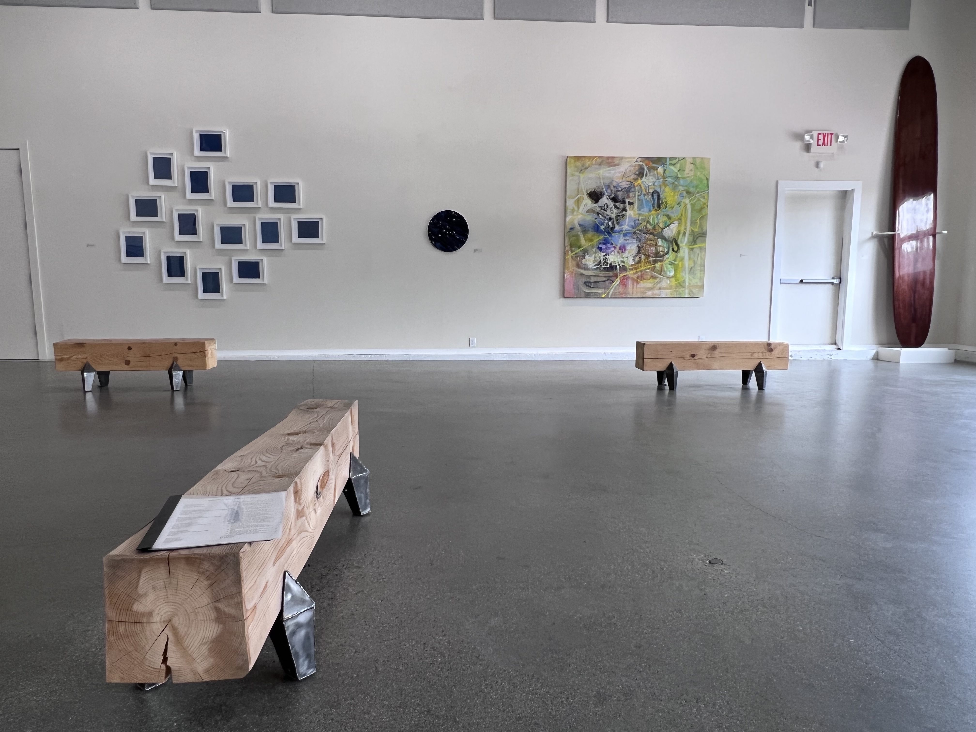 Artworks in Rising Tide also play with scale. While Coffin’s contribution is made up of a visual archipelago of smaller works, a painting nearby by Kris Chatterson is radically larger in size. Chatterson’s Surfy Art Project, completed in 2022 is ten feet tall and, in its scope takes on the grandiosity of something akin to an historical altarpiece or history painting. In the foreground, an upturned surfboard slides into space, while vividly baroque waves of color meander overheard. Executed in acrylic and mixed media on canvas, it is a stunning painting.