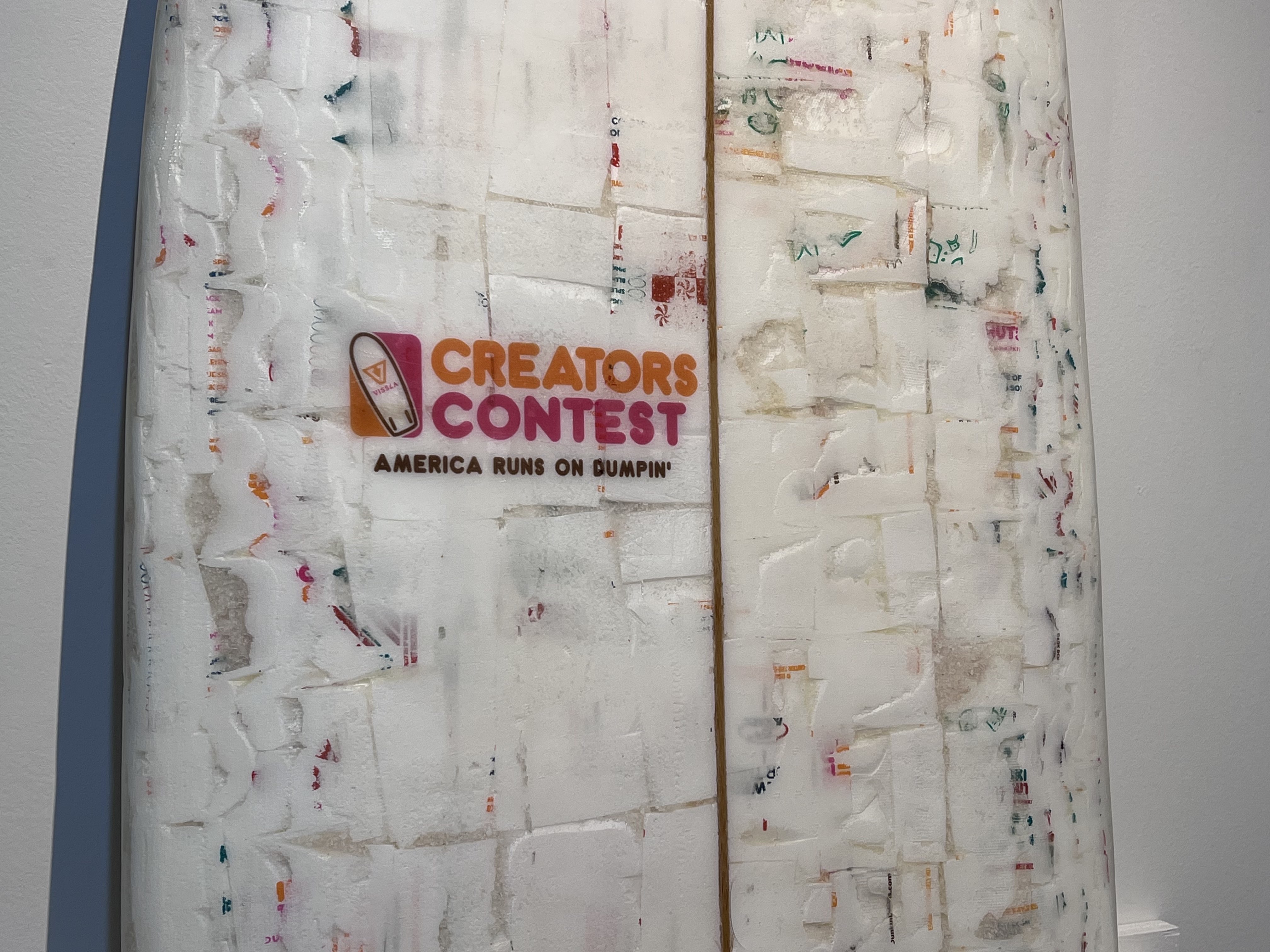An exhibition about the nexus between surfing and art would not be complete without the tools of the trade. A lit shadow box at the opening of the show includes a series of four fins by Korey Nolan. Created out of polyurethane and fiberglass cloth, this collection celebrates the craft behind surfing. The four fins are marbled and elegant and could as easily be mid century sculptures. Nolan has also contributed two boards to the show. One, titled Yewwlatta, was created using recycled Dunkin Donuts cups and straws resulting in a noticeable styrofoam look. The other, titled Downeast Soft Top New England, employs reclaimed lobster buoys, shipping crate lumber, teak and mahogany decking, salvaged cork boards, and recycled aluminum. It is the grittier of Nolan’s boards, but one steeped in New England culture. On the other end of the gallery, a surfboard by Andrew Nota is a sleek pillar of warm redwood against the venue’s cool walls.