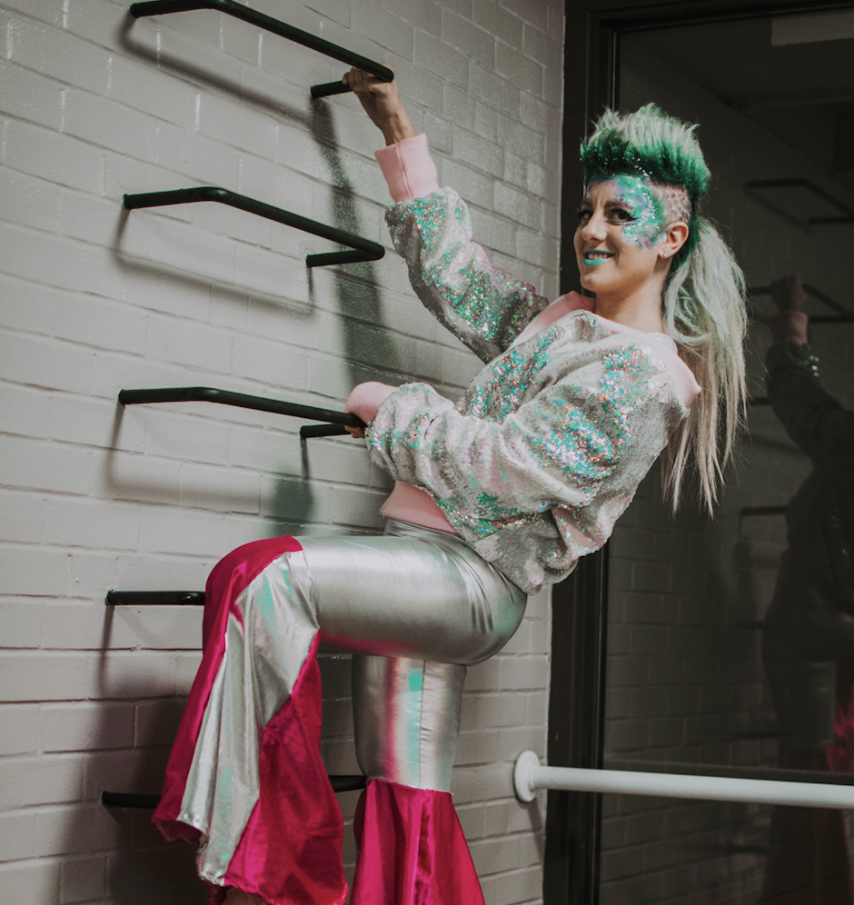 Melissa Thyden, of Sutton, MA, and now East Boston, is curator of both this exhibit and the fashion show, and an artist, fashion designer and fun-loving space girl inspired by unicorns, mermaids, rainbows, the pop culture of her youth and particularly, music. She studied illustration with a fashion focus at UMass Dartmouth.