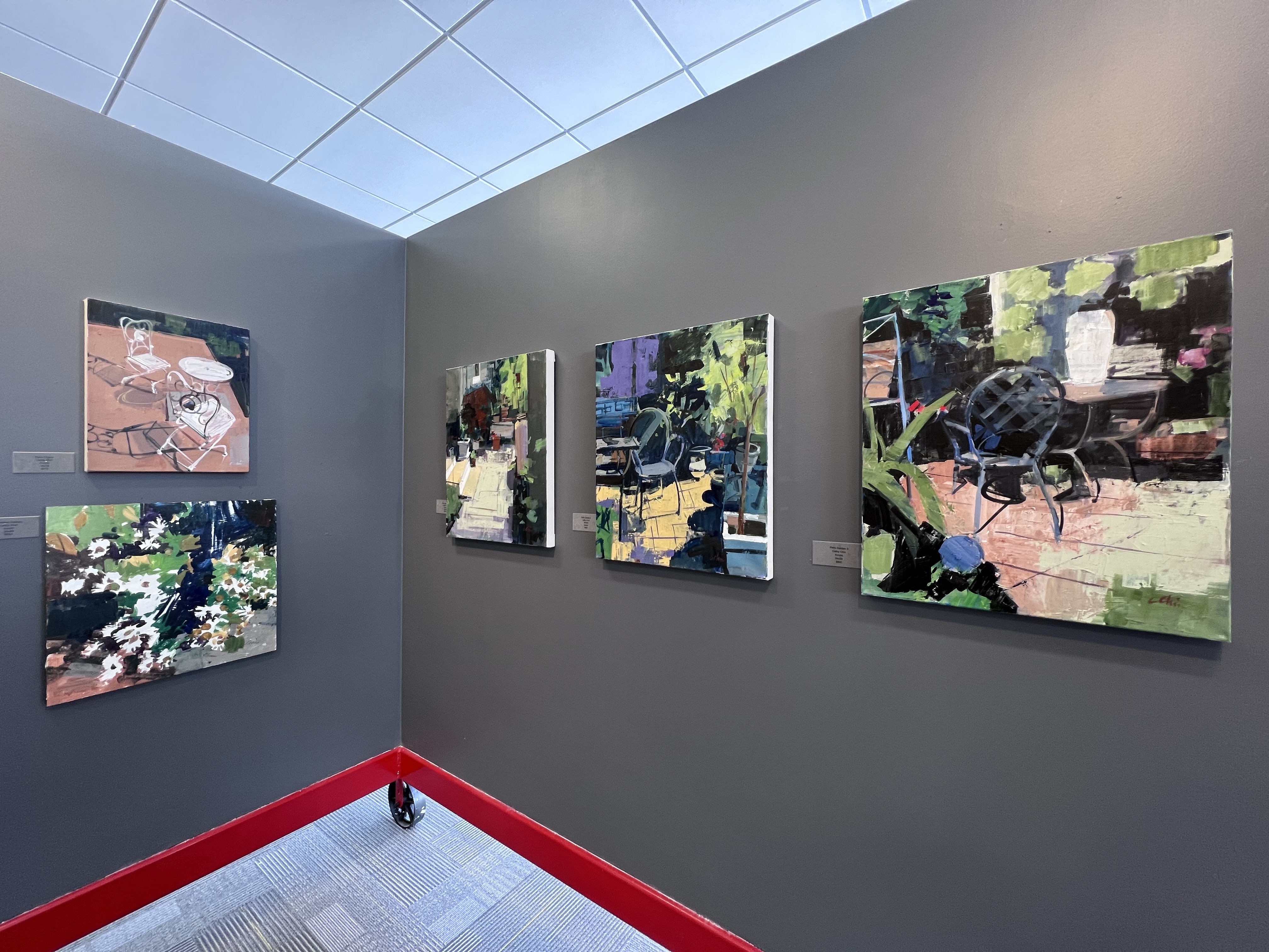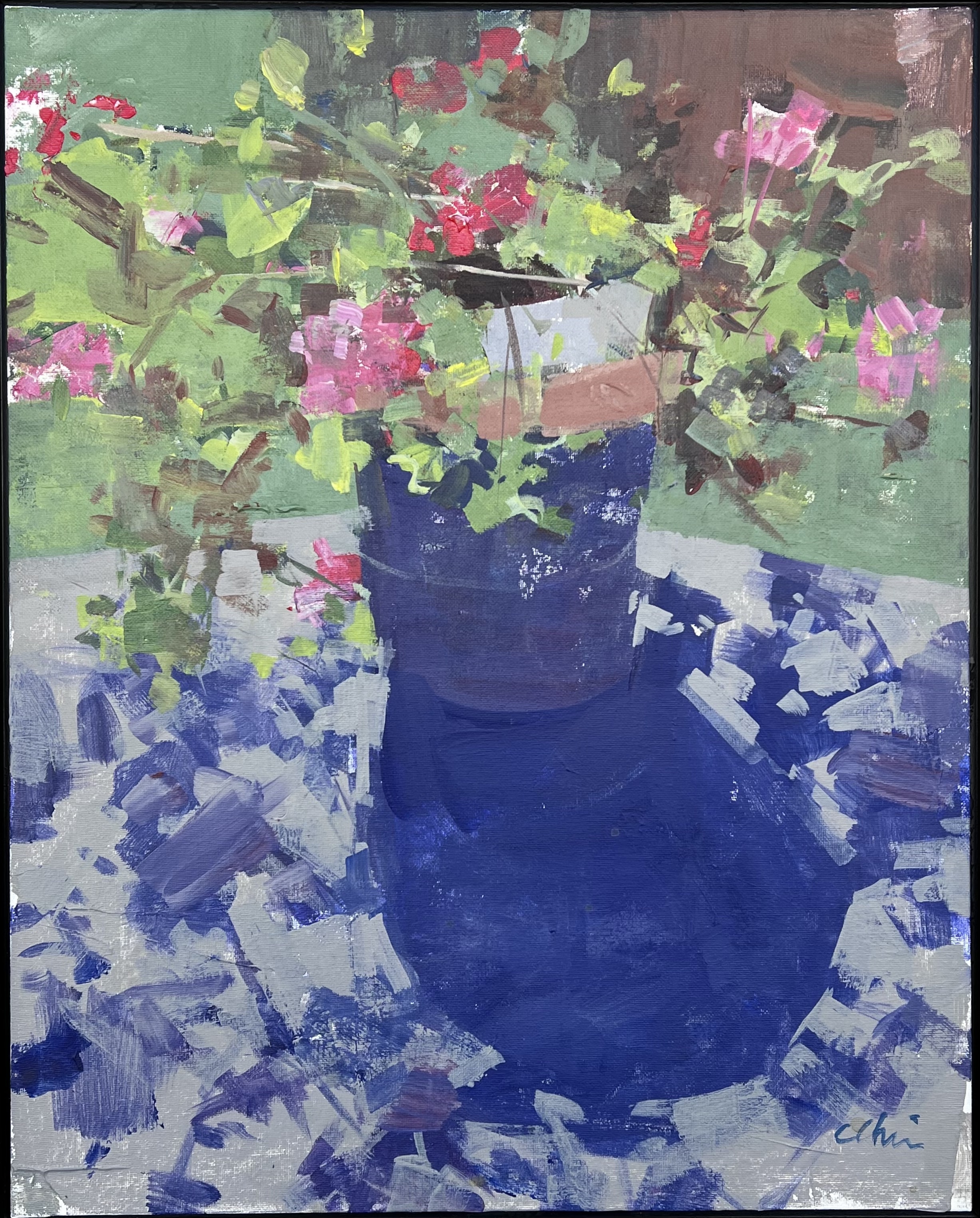 Chin’s work bears a distinctive and gestural hand that is immediately recognizable. Her art always, regardless of subject, has a bright and sun-drenched quality. When she turns her eyes to the garden themes presented in her current exhibition, her second solo at Dryden, the results are stunning. The subjects portrayed in the show range from stout potted plants, to meandering strings of beach roses, to architecturally-inclined renderings of outdoor furniture or botanical gardens.